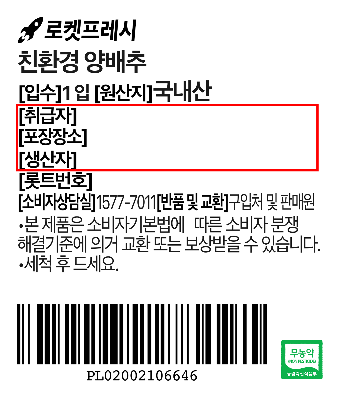 | 배송방법 | 신선/냉장/냉동 | 배송비 | 무료배송 - 로켓프레시 상품 중 15,000원 이상 구매 시 무료배송 - 해당 서비스 가능 지역에 한함 |