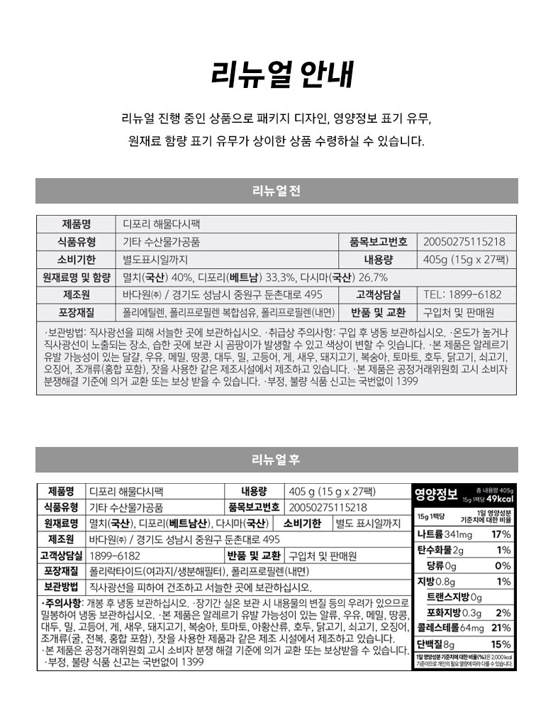 | 포장단위별 내용물의 용량(중량), 수량 | 컨텐츠참조 | 원재료명 및 함량 | 리뉴얼 전 : 컨텐츠 참조 / 리뉴얼 후 : 컨텐츠 참조 |