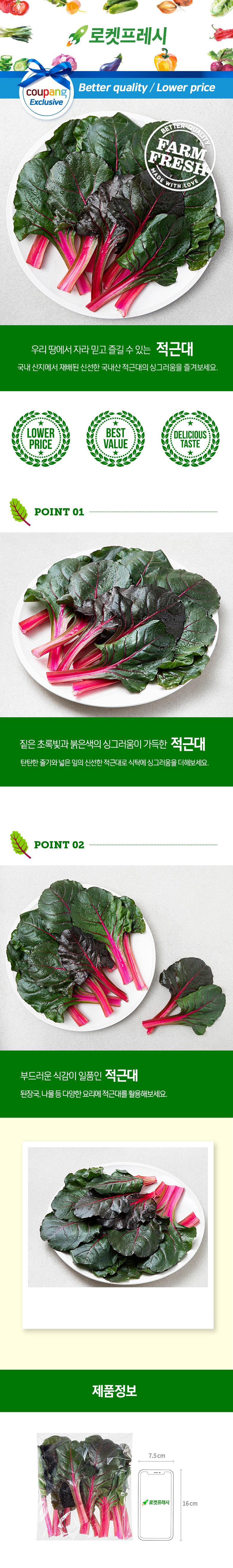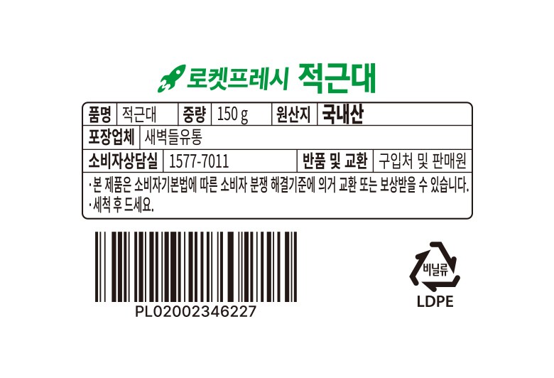 | 품목 또는 명칭 | 국내산 적근대 | 포장단위별 내용물의 용량(중량),수량,크기 | 150g |