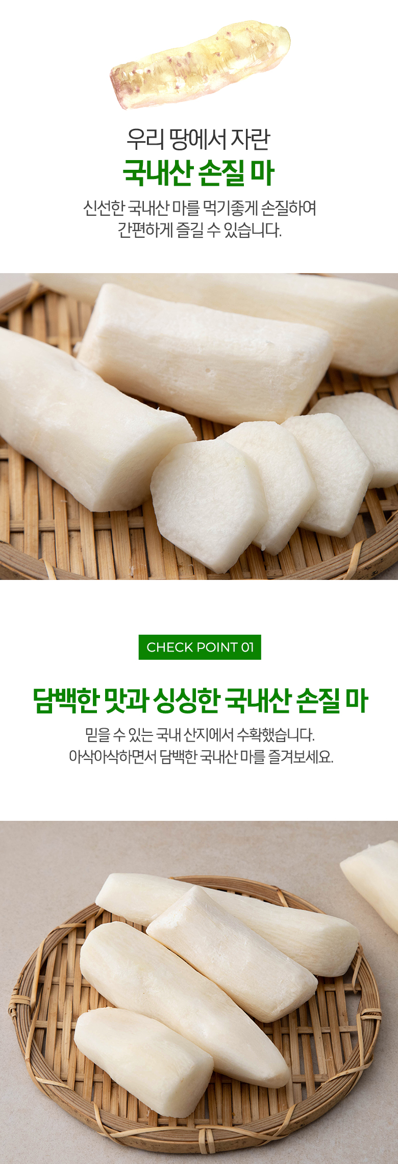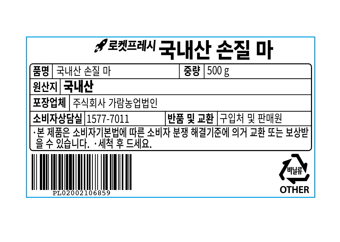 | 품목 또는 명칭 | 국내산 손질 마 | 포장단위별 내용물의 용량(중량),수량,크기 | 500gx1개 |
