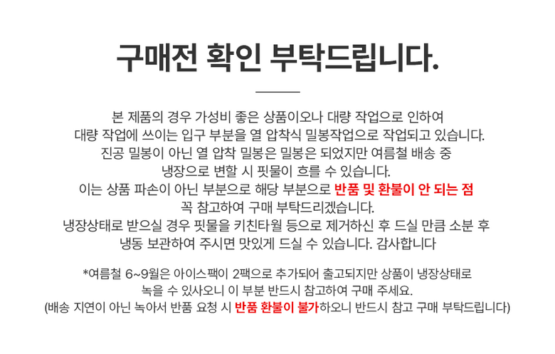 - ㆍ모니터 해상도의 차이로 인해 색상이나 이미지가 실제와 달라, 고객이 단순 변심으로 교환/반품을 무료로 요청하는 경우