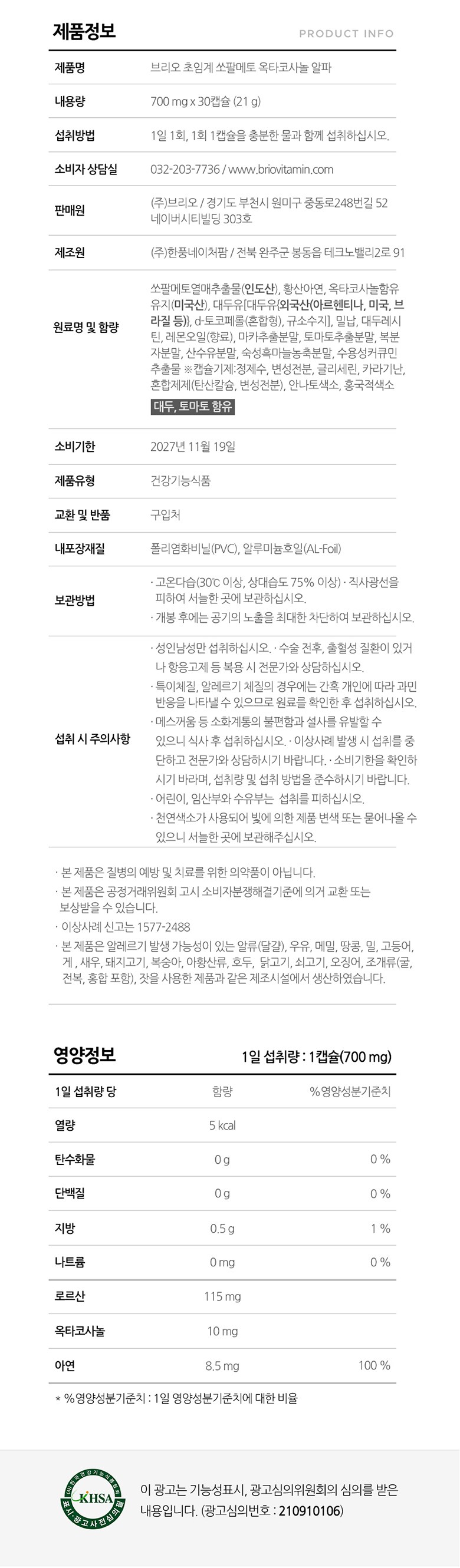 | 원료명 및 함량 | 상품 상세페이지 참조 | 영양정보 | 상품 상세페이지 참조 |
