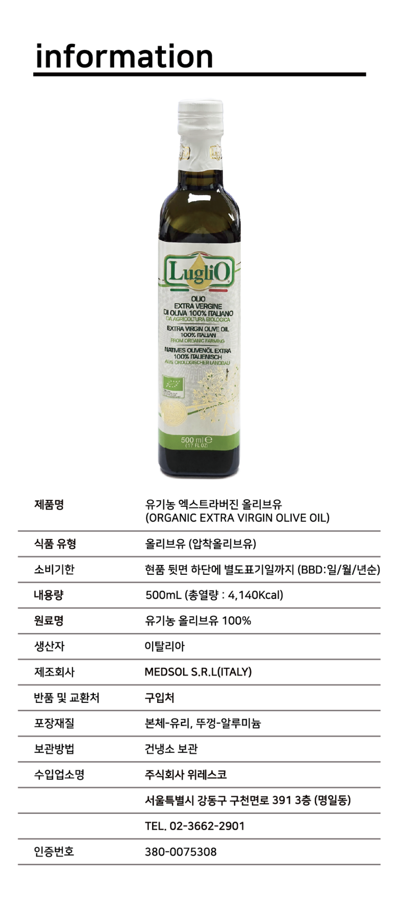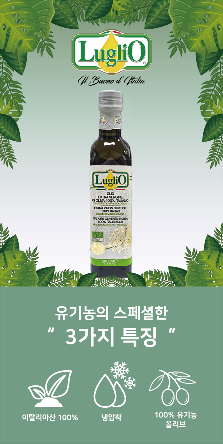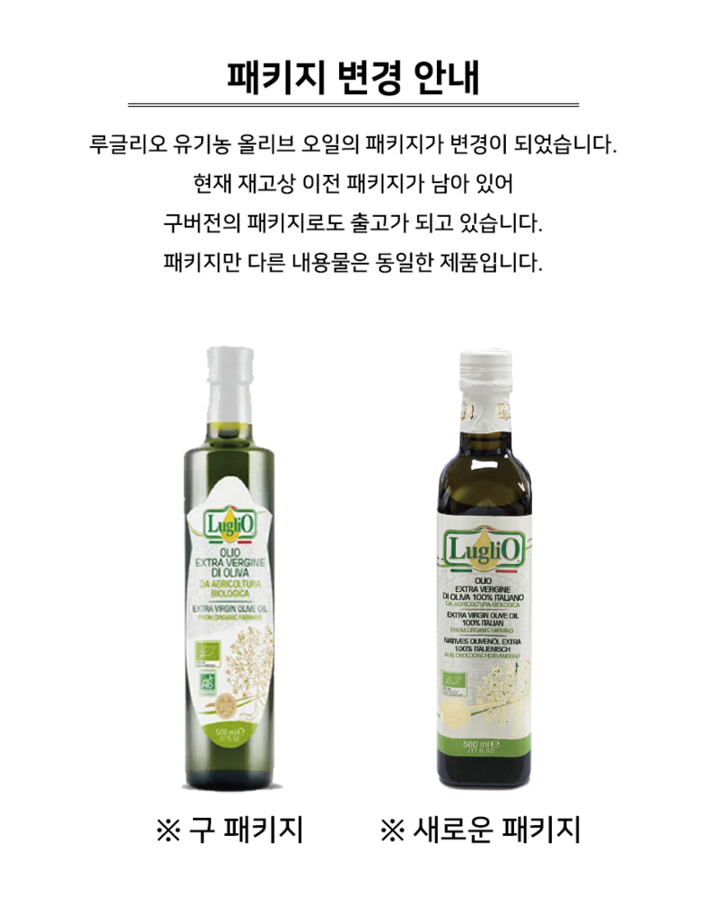 | 포장단위별 내용물의 용량(중량), 수량 | 500ml | 원재료명 및 함량 | 유기농 올리브유 100% |