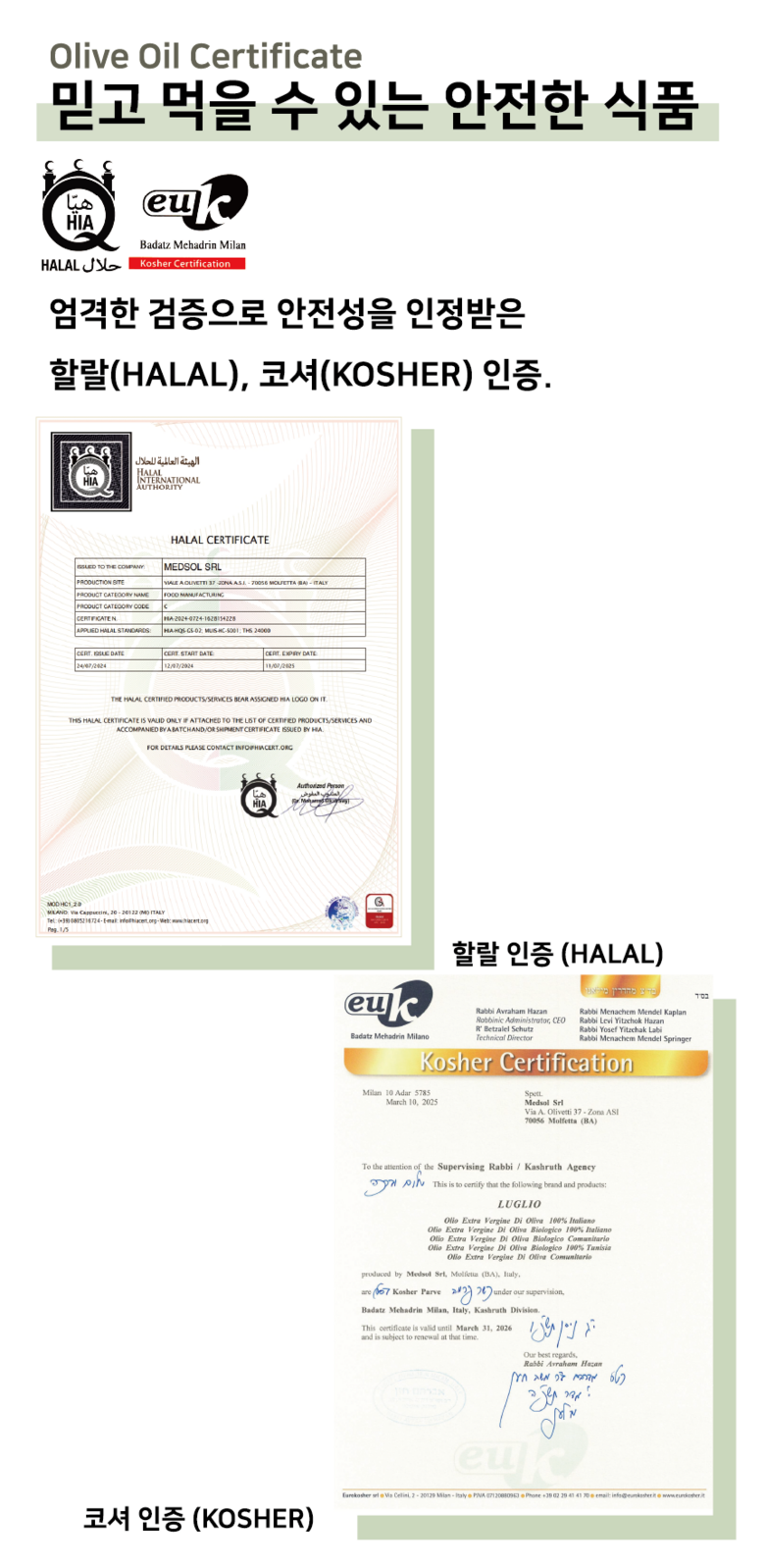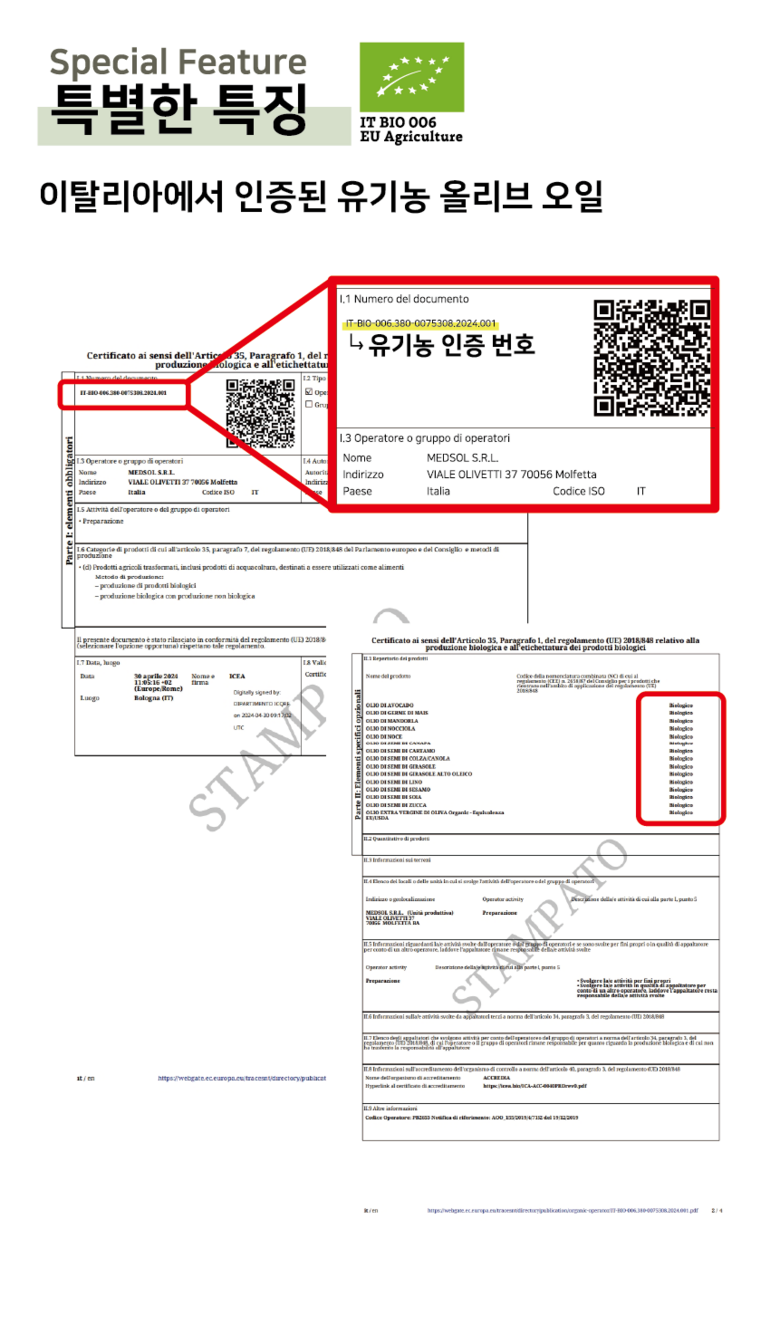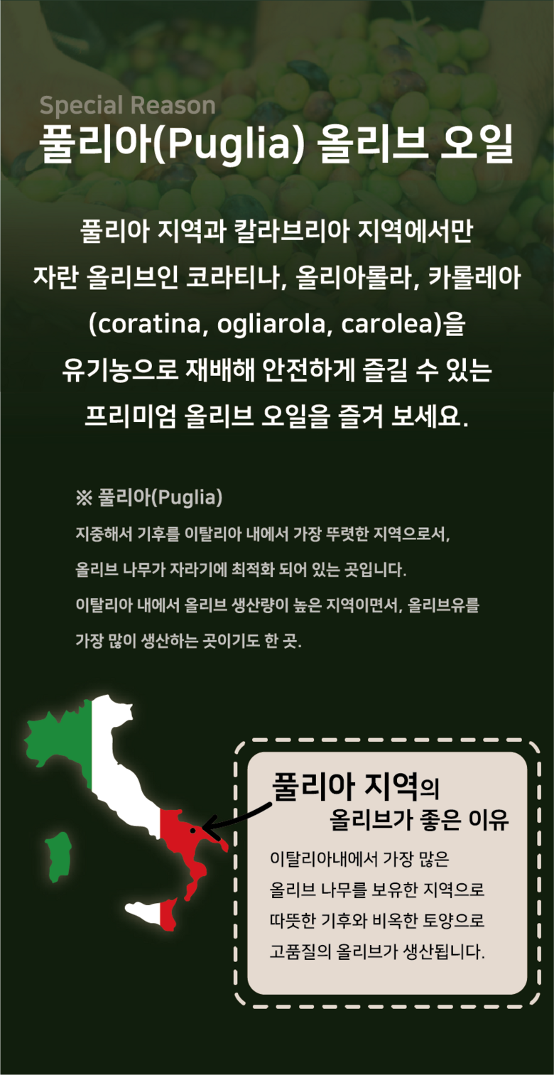 | 포장단위별 내용물의 용량(중량), 수량 | 500ml | 원재료명 및 함량 | 유기농 올리브유 100% |