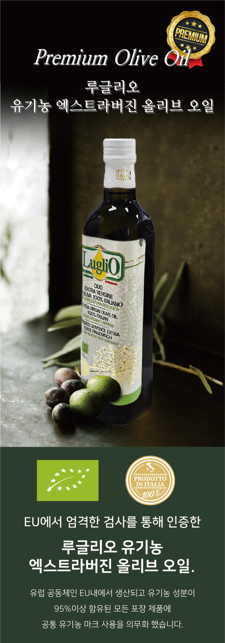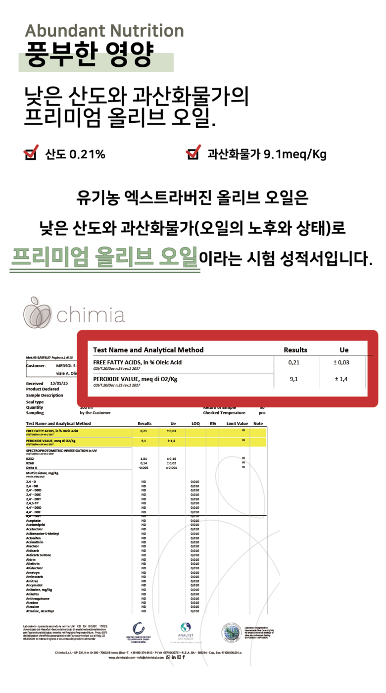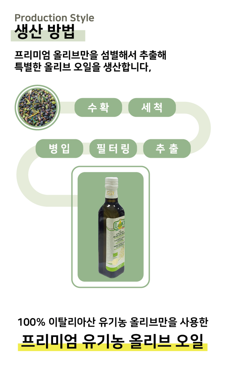 | 제품명 | 유기농 엑스트라버진 올리브유 | 식품의 유형 | 올리브유 (압착올리브유) |