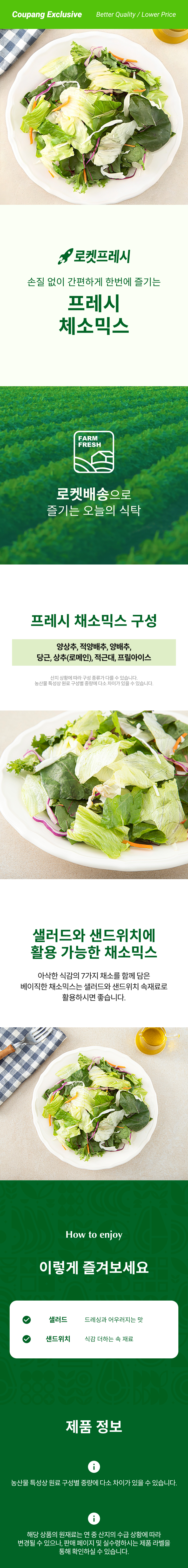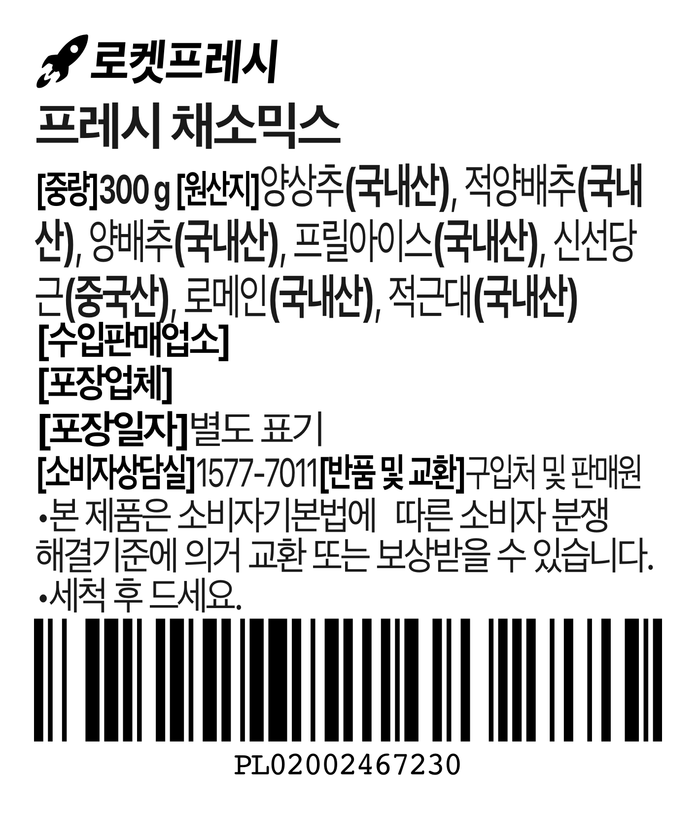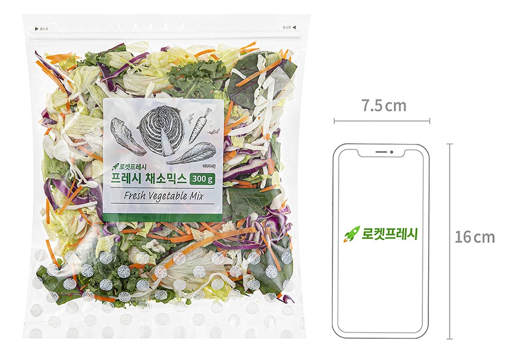 | 품목 또는 명칭 | 프레시 채소믹스 | 포장단위별 내용물의 용량(중량),수량,크기 | 300g x 1개입 x 1개 |