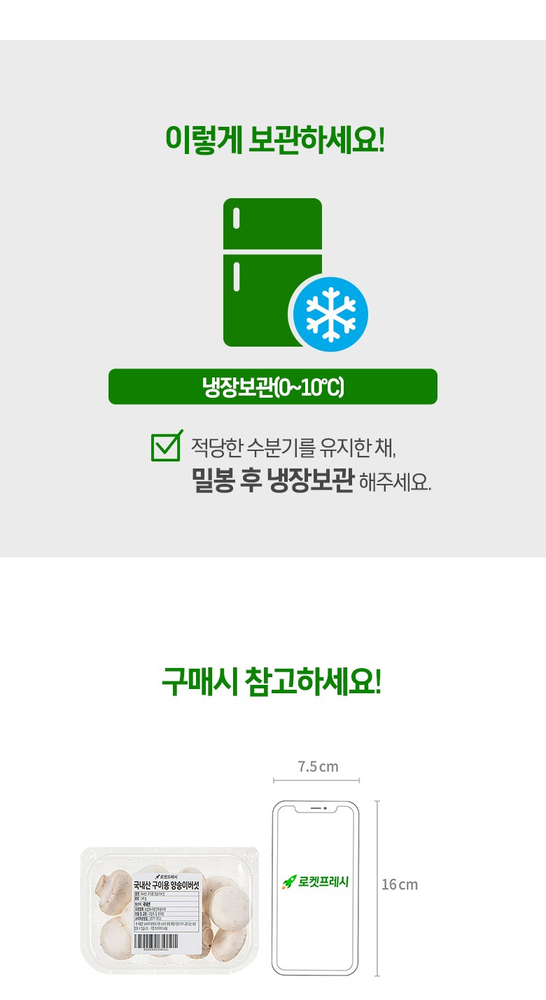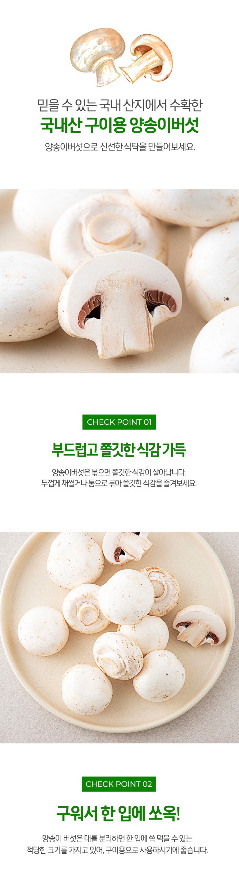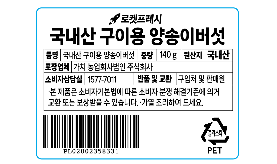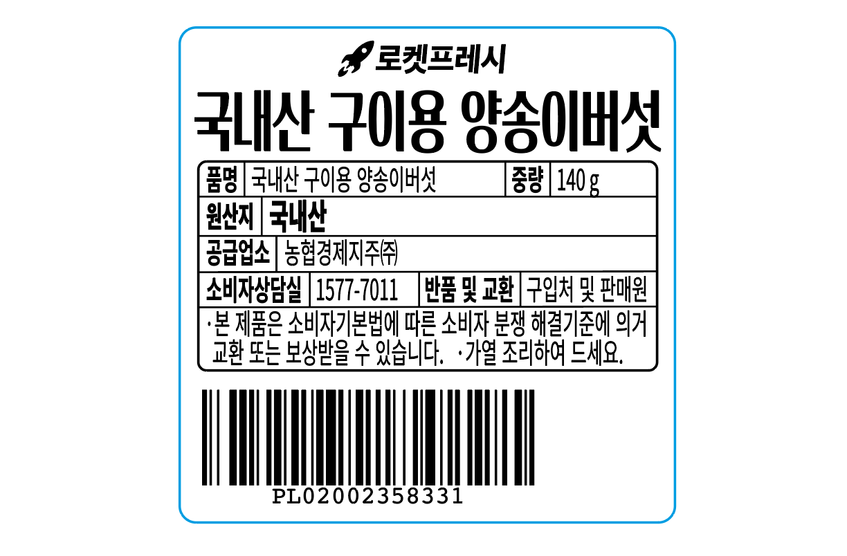 | 품목 또는 명칭 | 국내산 구이용 양송이버섯 | 포장단위별 내용물의 용량(중량),수량,크기 | 140g x 2개 |