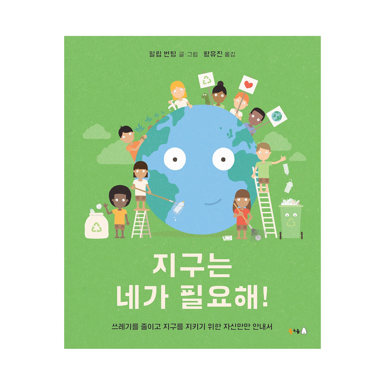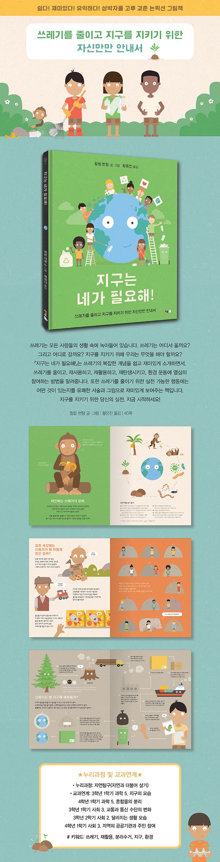 ✔ 출판사 : 북극곰 ✔ 제목 : 지구는 네가 필요해! : 쓰레기를 줄이고 지구를 지키기 위한 자신만만 안내서 ✔ 글·그림 : 필립 번팅 ✔ 옮긴이 : 황유진 ✔ 분야 : 어린이 ✔ 출간일 : 2021년 02월 19일 ✔ 면수 : 40쪽 ✔ 판형 : 225*275
