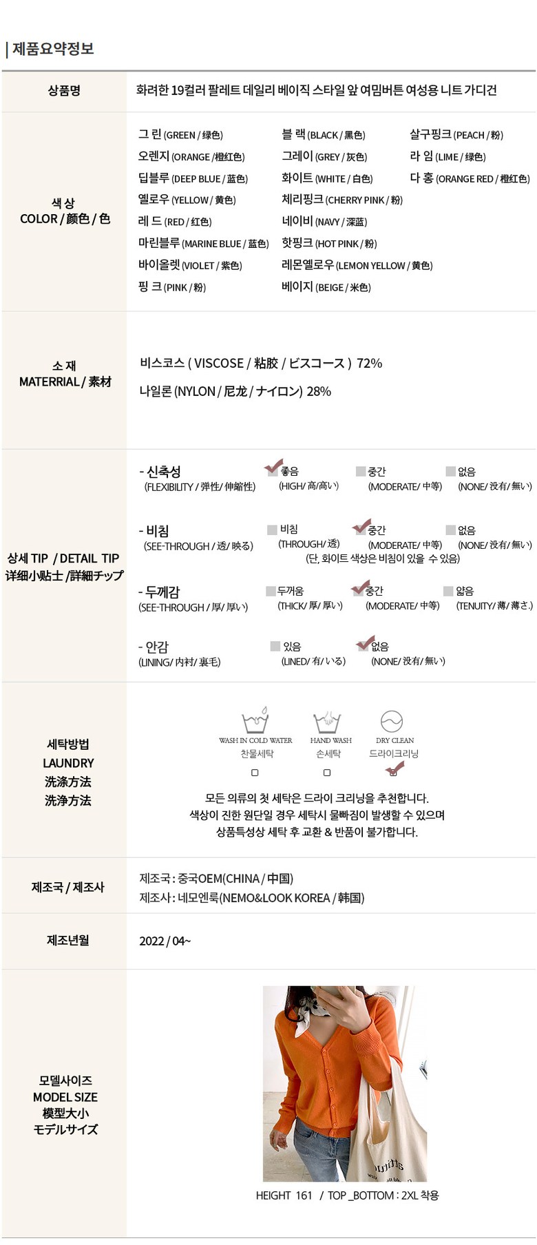 | 제조국 | 중국OEM | 세탁방법 및 취급시 주의사항 | 컨텐츠참조 |