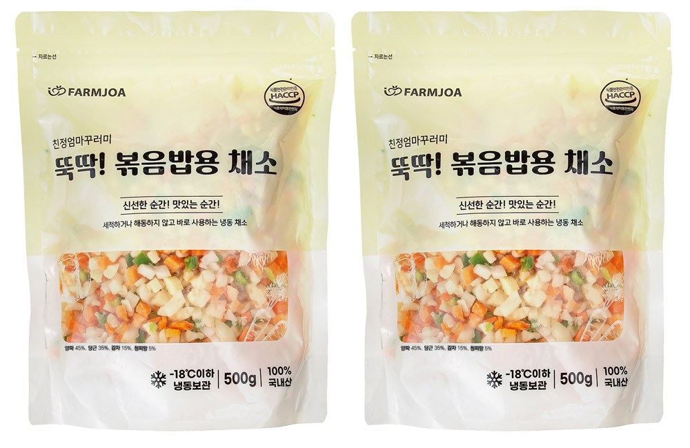 요리의 번거로움을 덜어줄 제품을 만나보세요. 야채를 손질한 후 냉동해 고유의 맛과 식감이 살아있답니다. 감자, 양파, 당근, 파프리카 등을 푸짐하게 담아 맛도 색감도 좋은 볶음밥을 요리할 수 있지요. 취향에 따라 햄, 치즈 등의 다양한 재료를 곁들여 요리해 보세요.