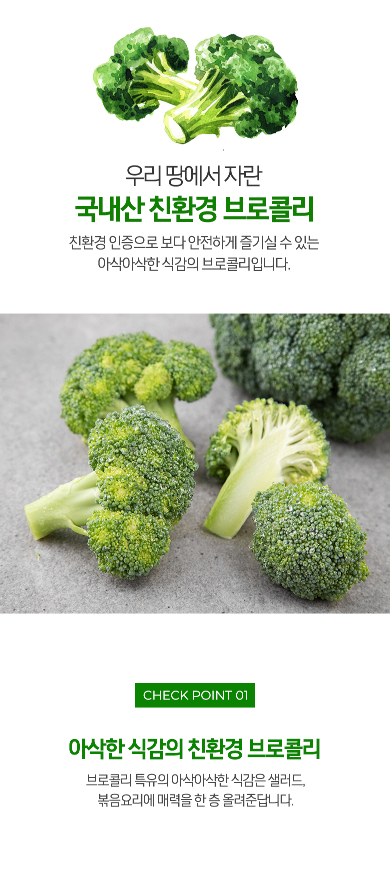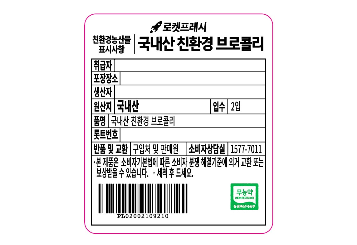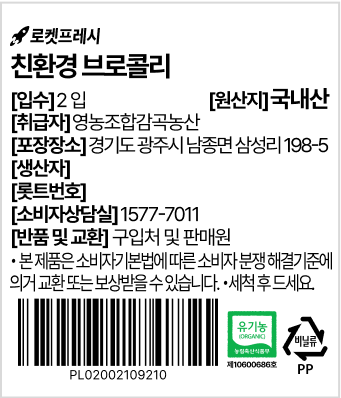 | 품목 또는 명칭 | 국내산 친환경 브로콜리 | 포장단위별 내용물의 용량(중량),수량,크기 | 2개입(500g)x2개 |