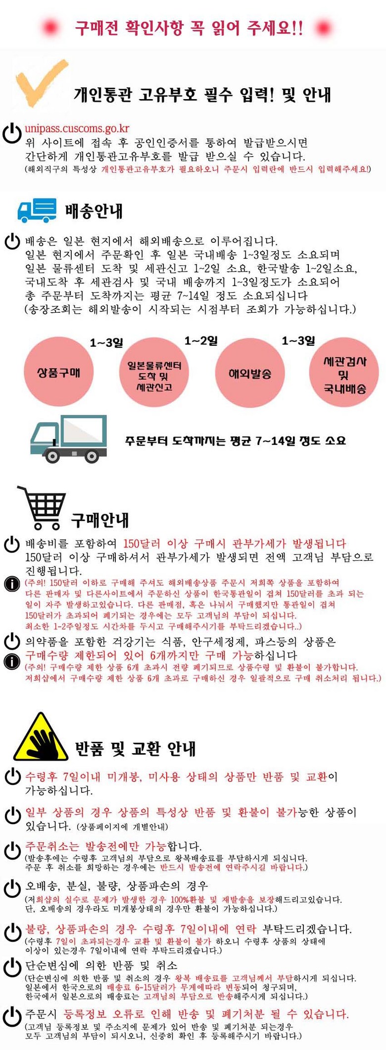 - 법규 개정에 따라 개인통관고유부호 검증 절차가 강화되었습니다. 결제 단계에서 받는 사람의 정보가 관세청 등록 정보 (성명, 휴대폰, 개인통관고유부호, 주소) 와 일치하는지 확인해주세요.