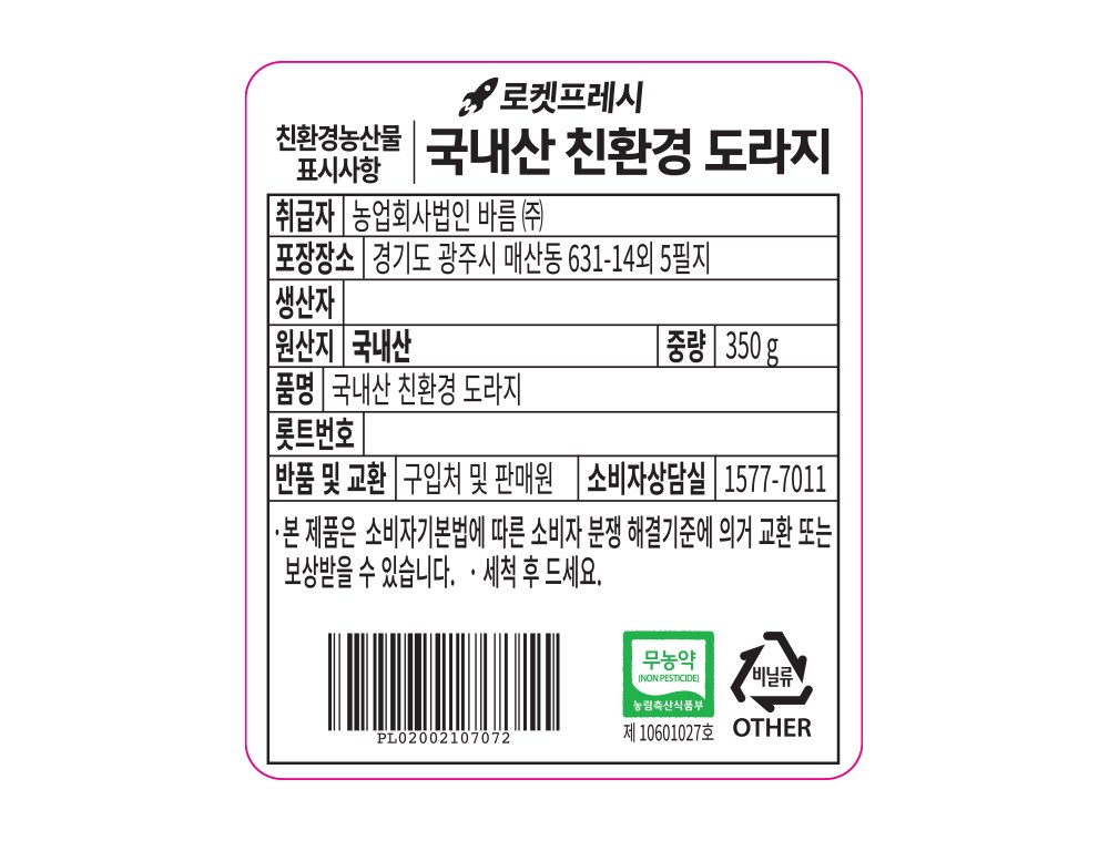 | 품목 또는 명칭 | 국내산 친환경 도라지 | 포장단위별 내용물의 용량(중량),수량,크기 | 350gx1개 |