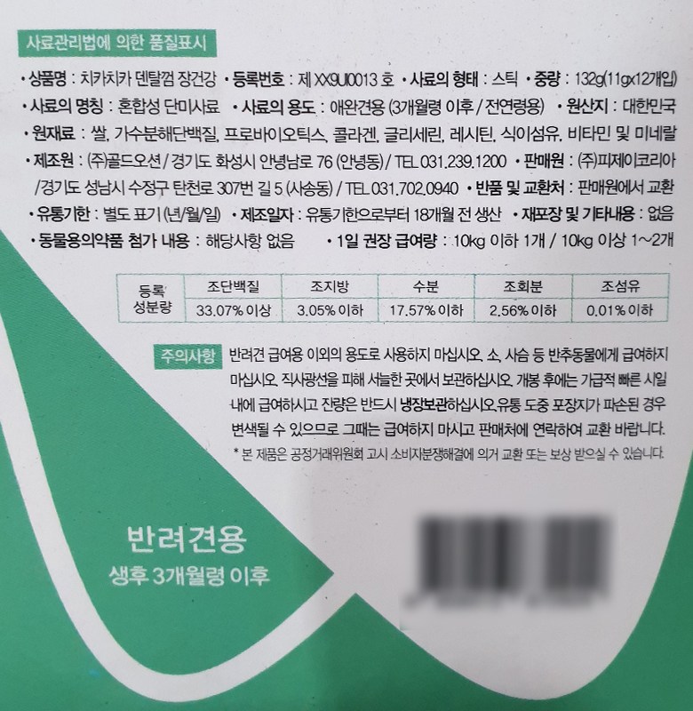 | 품명 및 모델명 | 치카치카 덴탈껌 장건강 | 인증/허가 사항 | 사료관리법에 따른 성분등록번호 : 컨텐츠 참조 |