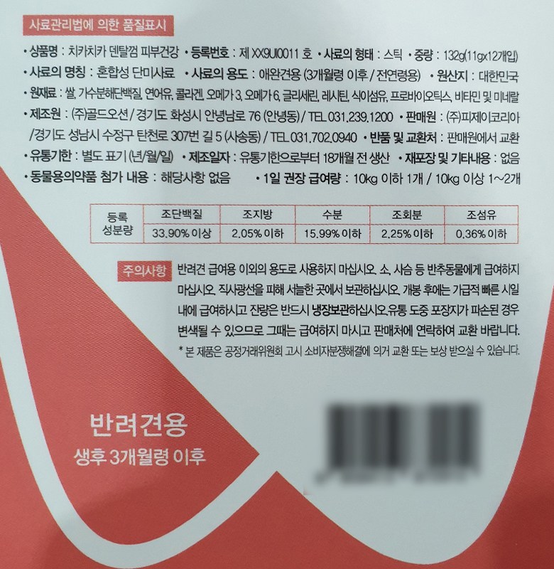 | 품명 및 모델명 | 치카치카 덴탈껌 피부건강 | 인증/허가 사항 | 사료관리법에 따른 성분등록번호 : 컨텐츠 참조 |