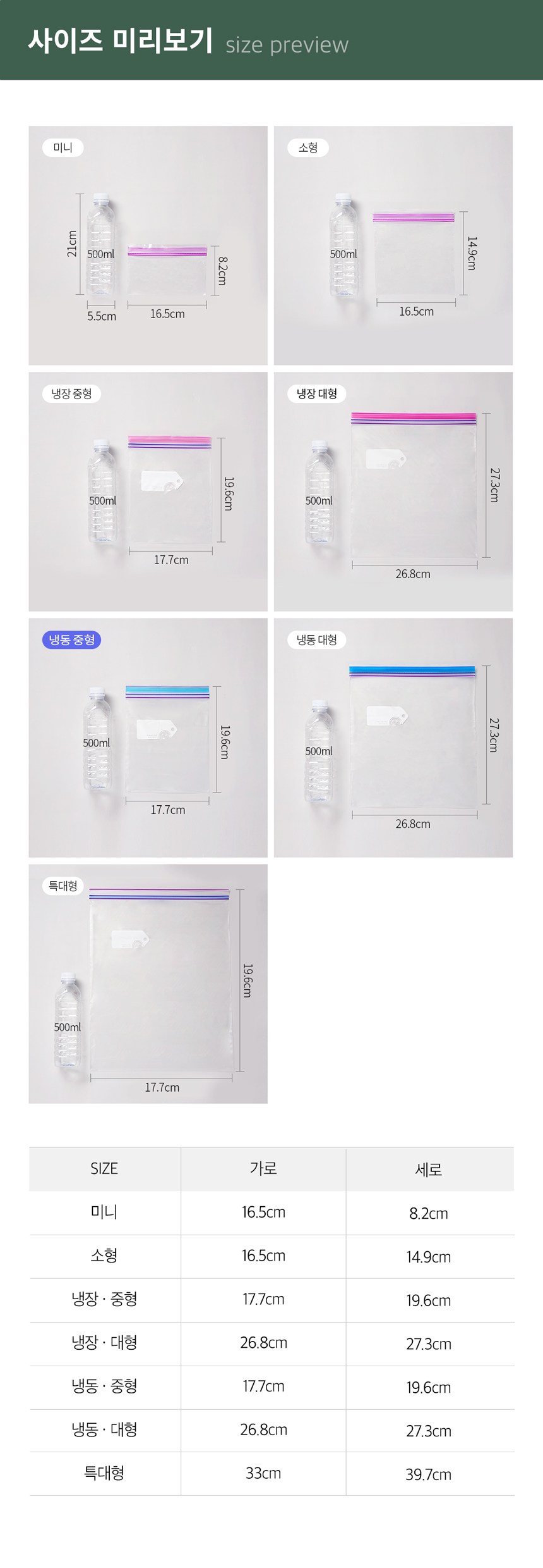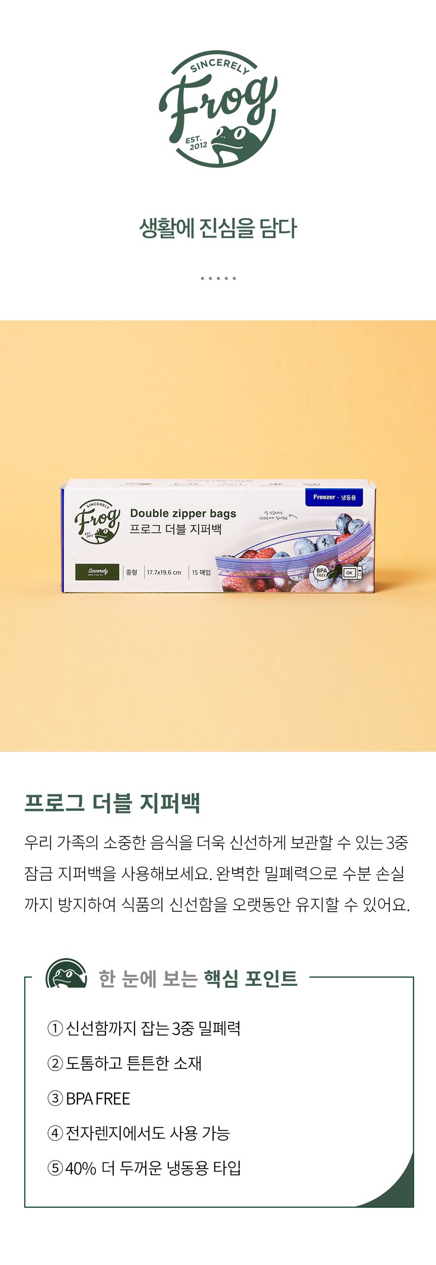 | 품명 및 모델명 | 프로그 더블 지퍼백 중형 15매입 냉동용 | 재질 | 컨텐츠 참조 |
