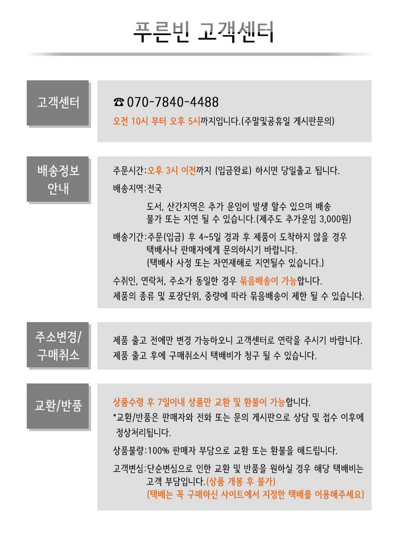 - 상품문의 및 후기게시판을 통해 취소나 환불, 반품 등은 처리되지 않습니다.