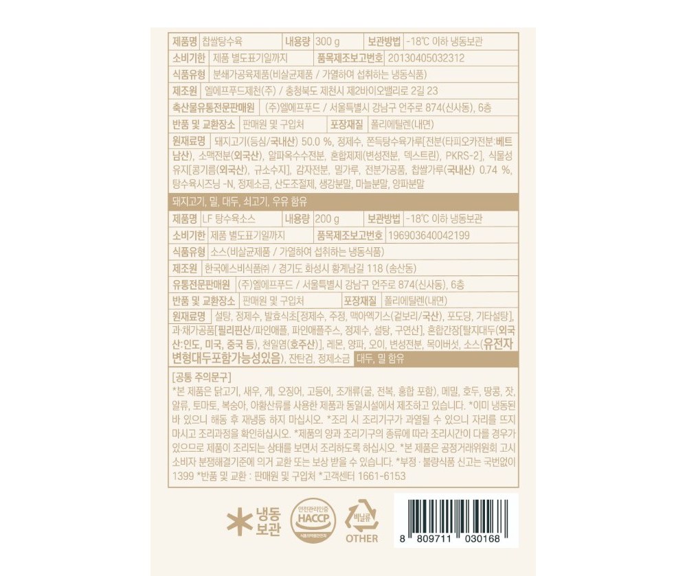 1. 냉동 상태의 탕수육을 에어프라이어에 넣고 180℃로 15분간 조리해 드세요.