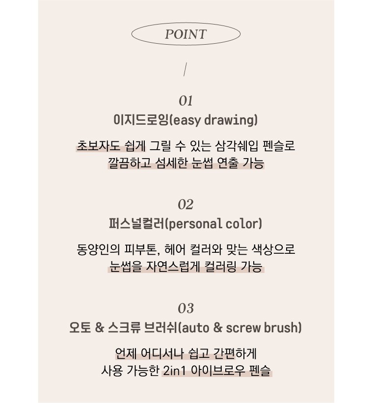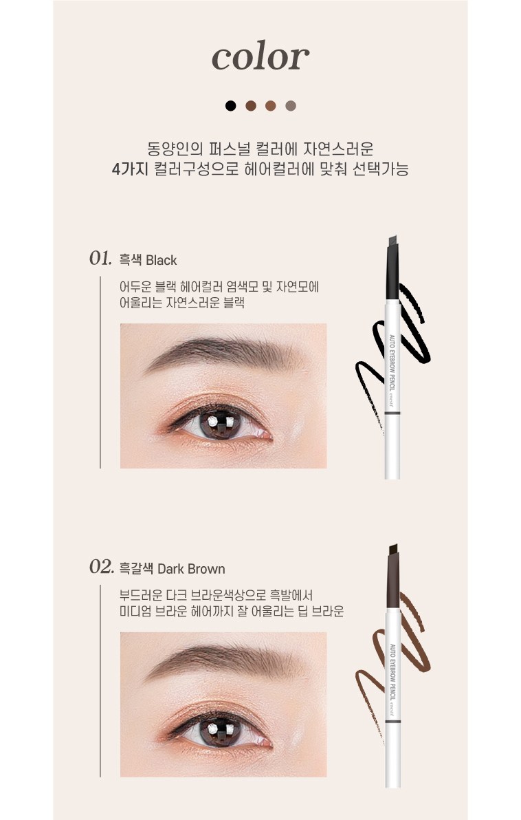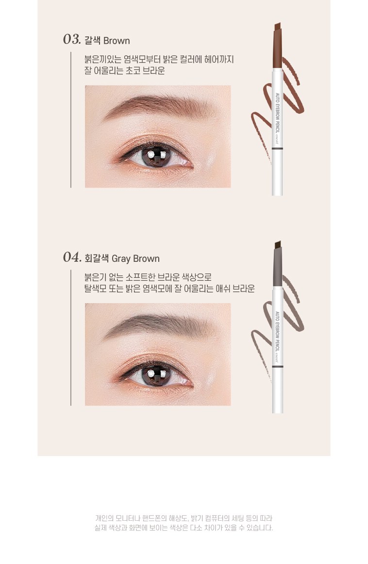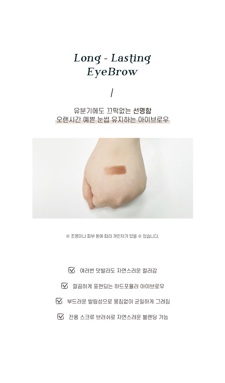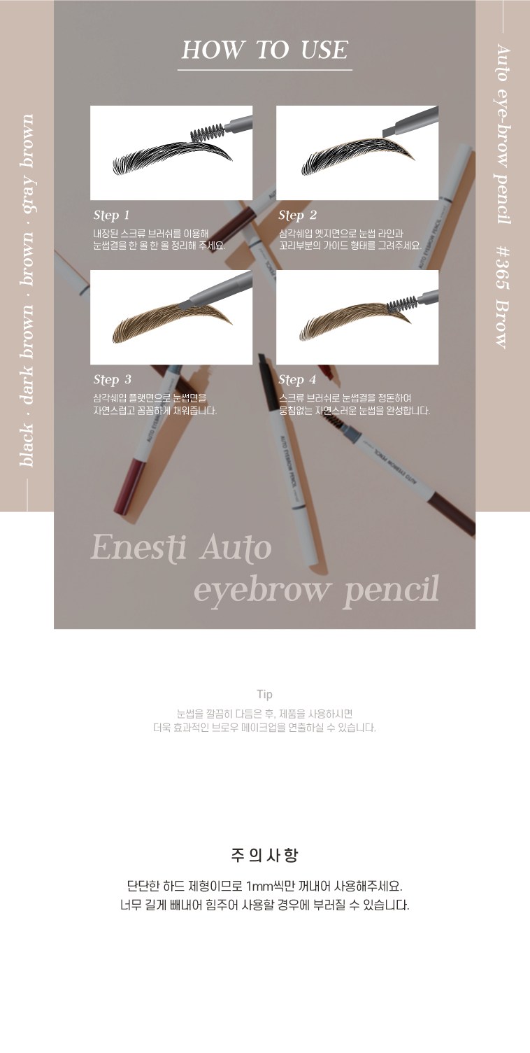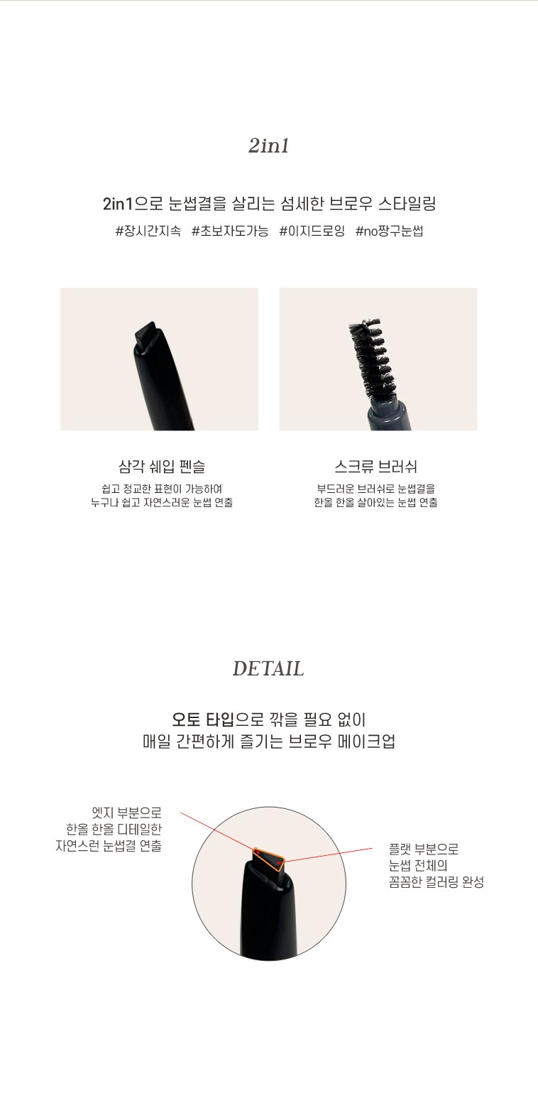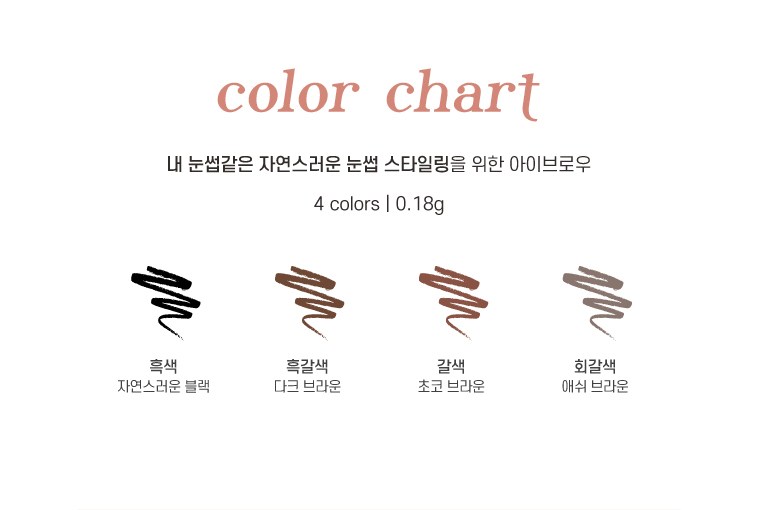 | 사용기한 또는 개봉 후 사용기간 | 본 상품은 해당 물류센터 직발송 상품인 관계로 제조연월일 및 사용기한 정보가 매번 변경되므로 상단 사용기한 정보를 참고해 주세요. | 사용방법 | 아이브로우 용기를 돌려 적당한 길이로 심을 올린 후 삼각 보양의 넓은 면으로 눈썹 앞머리와 전체적인 라인을 만들어 주고, 얇은 면으로 세심하게 다듬어 주면서 원하는 눈썹 모양으로 가겹게 3~4회 그려 줍니다. |