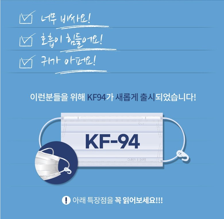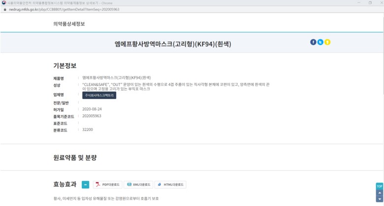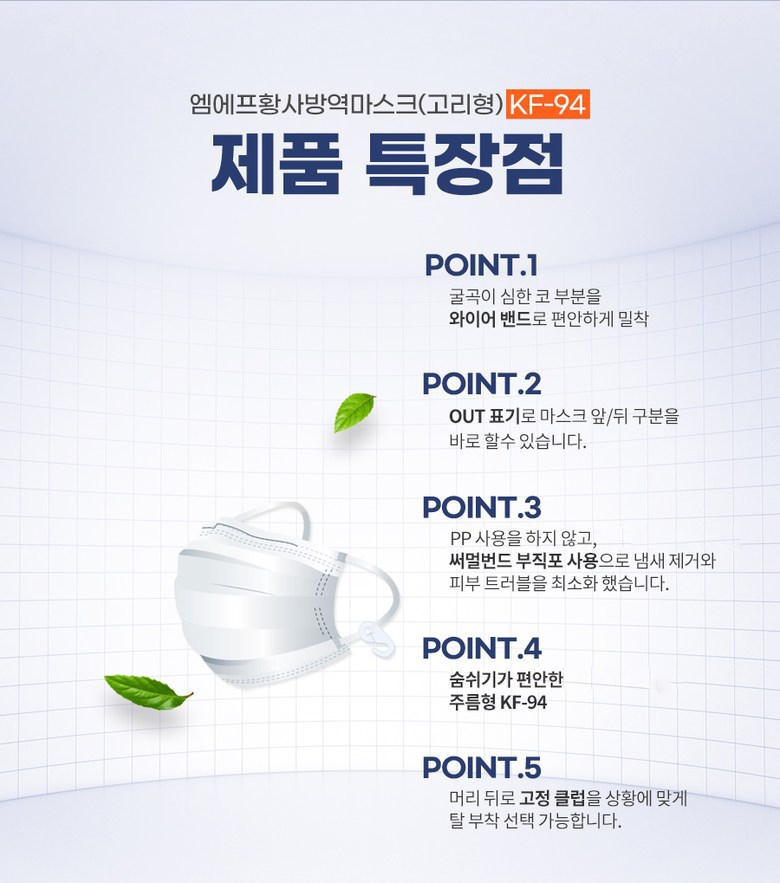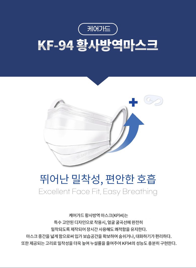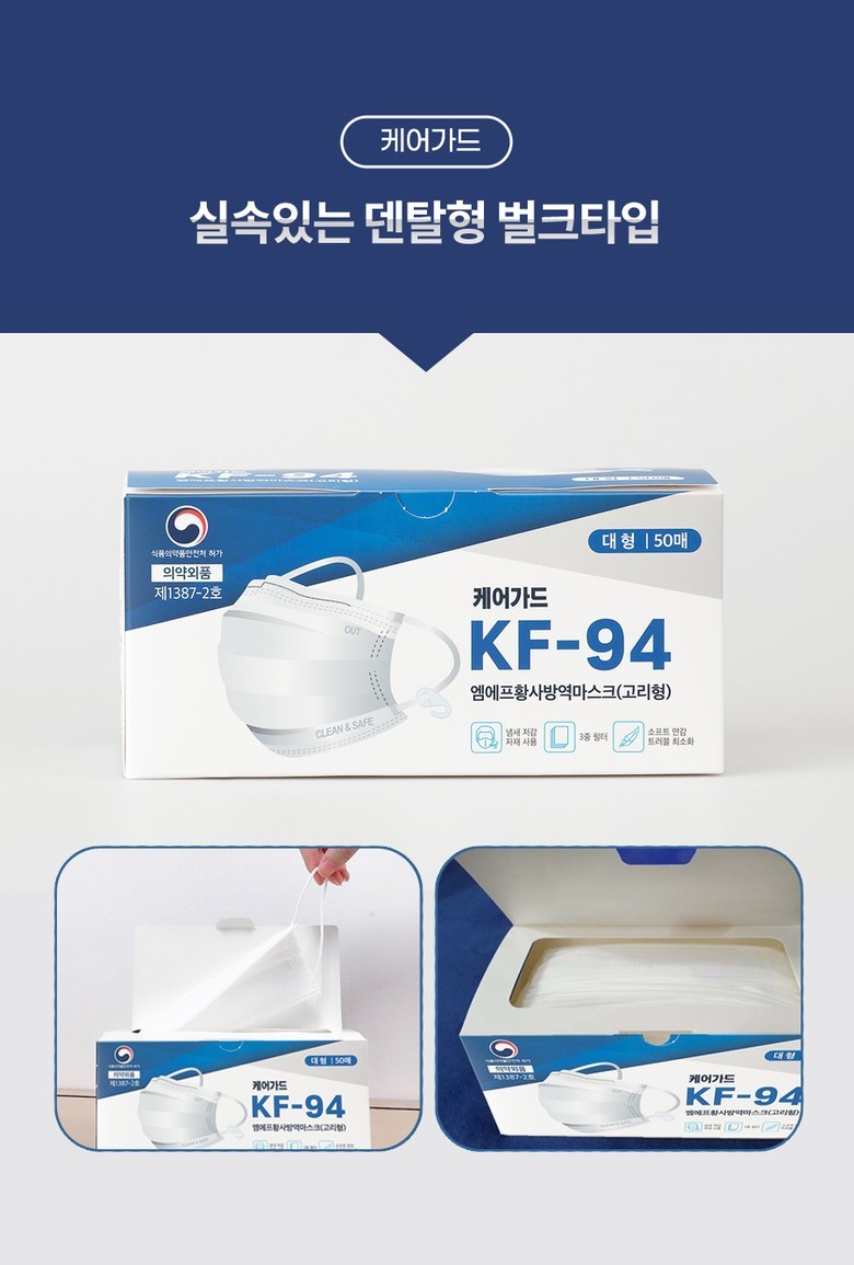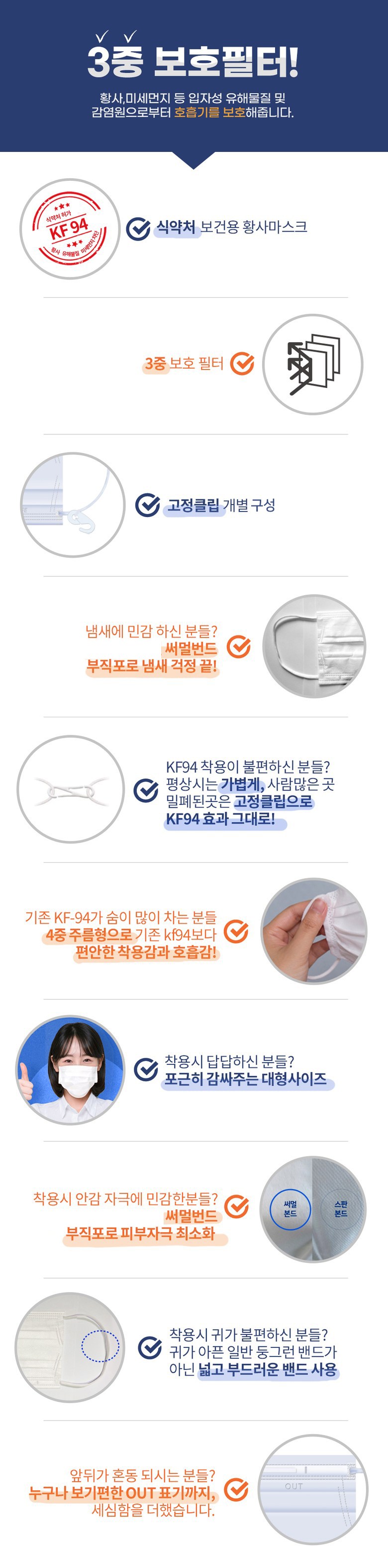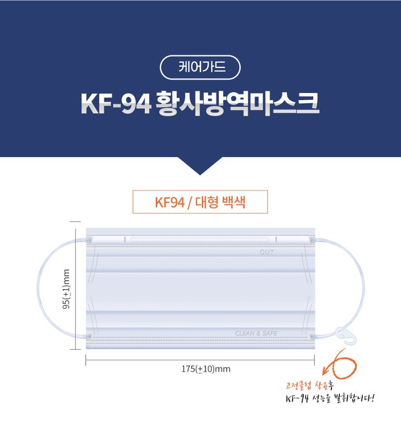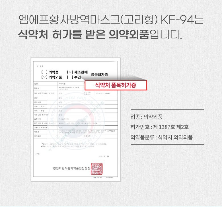 | 품명 및 모델명 | 엠에프황사방역마스크(고리형)(KF94)(흰색) | 인증/허가 사항 | 의약외품 |