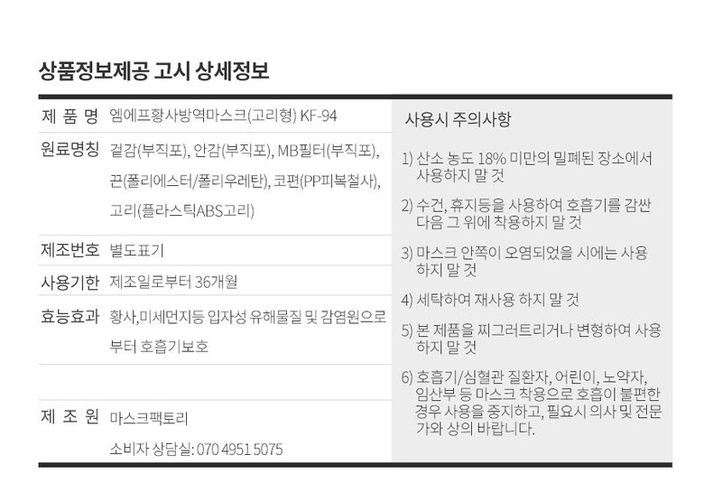| 제조국(원산지) | 대한민국 | 제조자(수입자) | 주식회사마스크팩토리 |