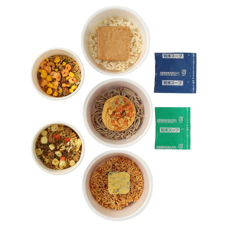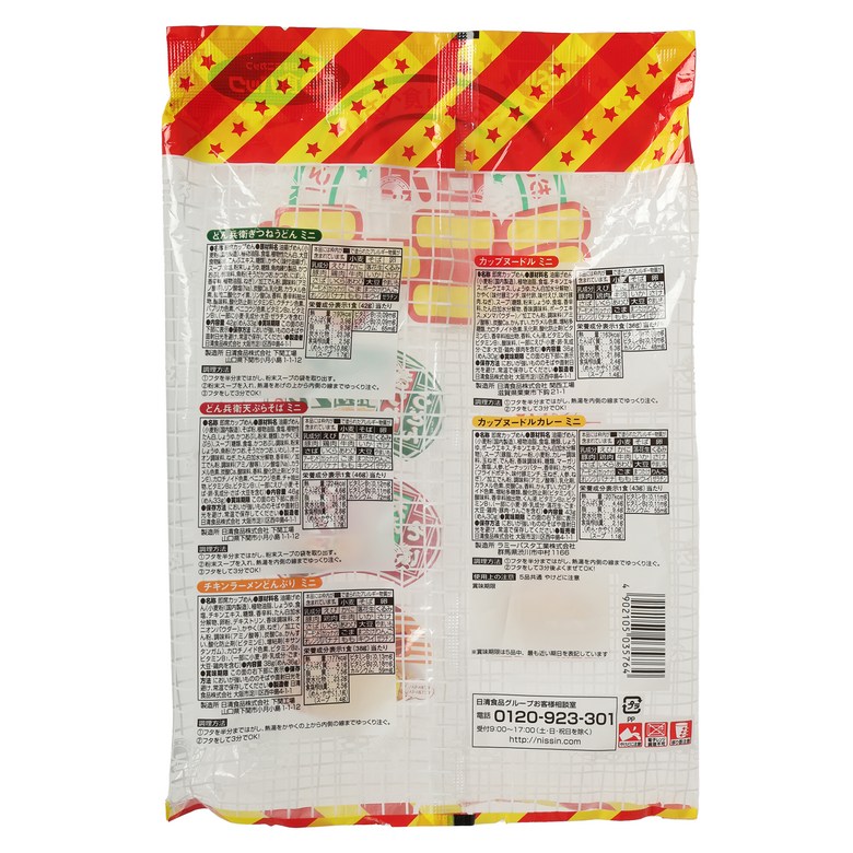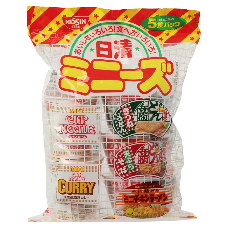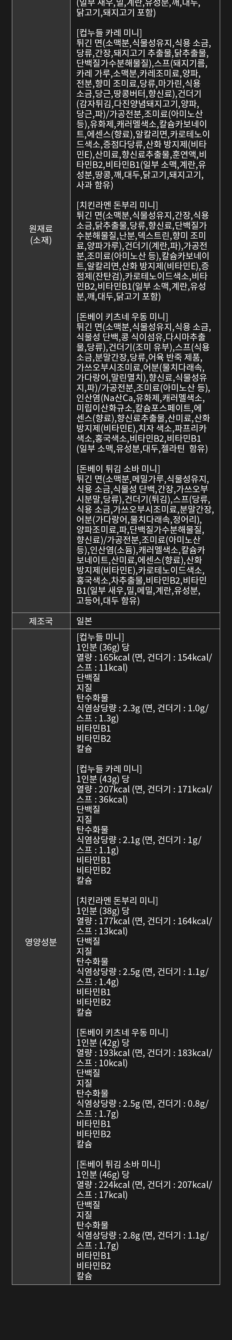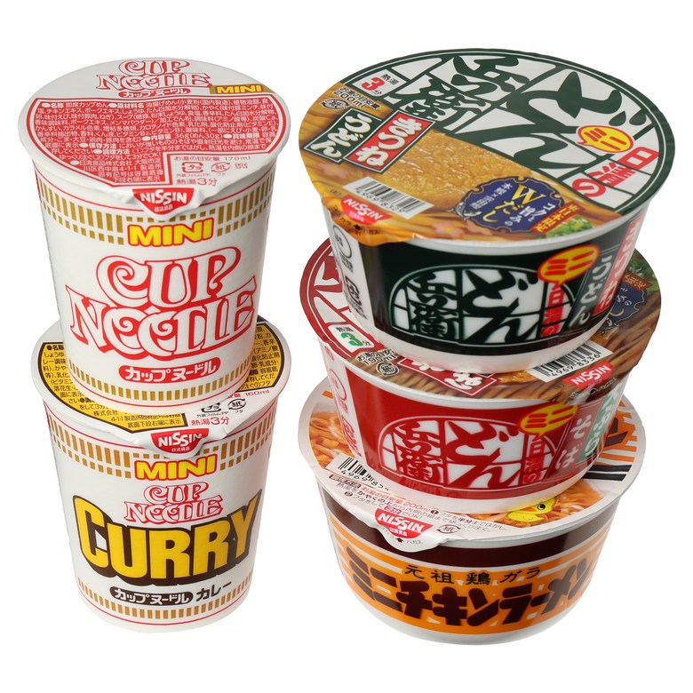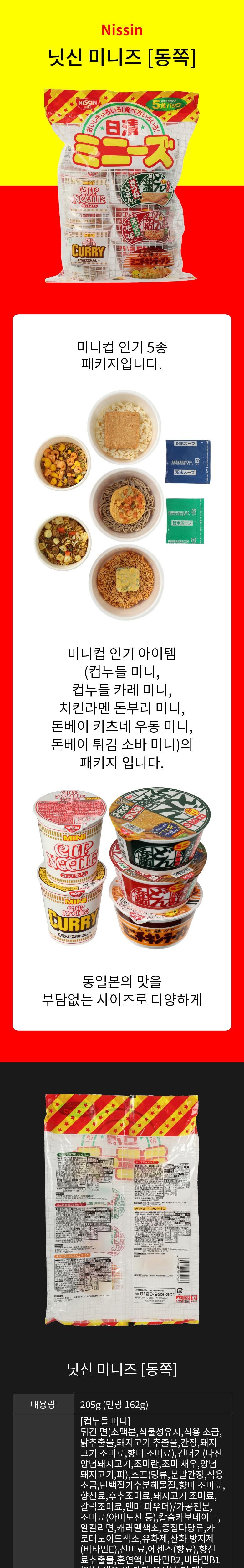 컵누들 미니, 컵누들 커리 미니, 치킨 라면 덮밥 미니, 돈베이 키츠네 우동 미니, 돈베이 튀김 소바 미니로 구성되어 있습니다.