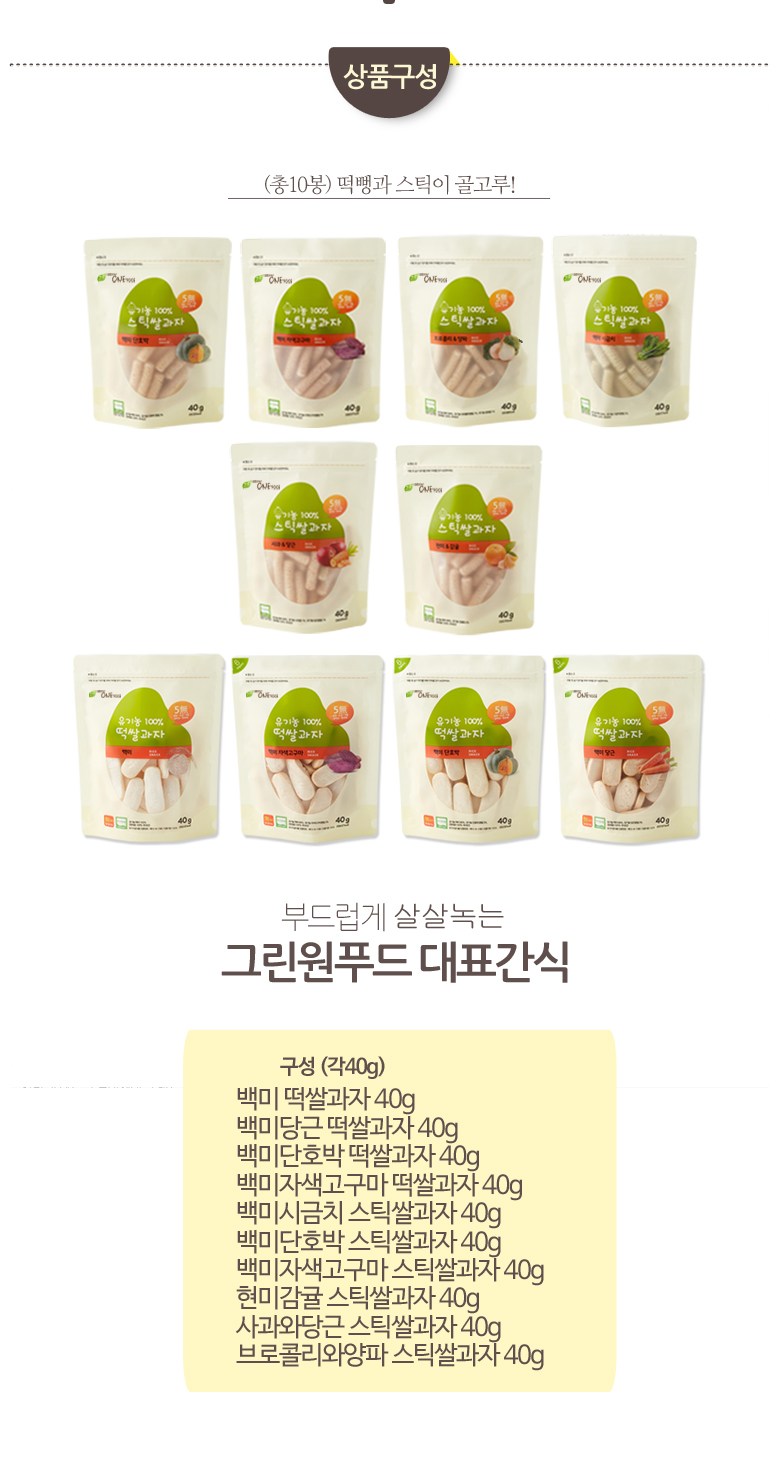 | 제조연월일, 소비기한 또는 품질유지기한 | 업데이트 예정 | 포장단위별 내용물의 용량(중량), 수량 | 백미 떡쌀과자 40g+백미당근 떡쌀과자 40g+백미단호박 떡쌀과자 40g+백미자색고구마 떡쌀과자 40g+백미단호박 스틱쌀과자 40g+벡미자색고구마 스틱쌀과자 40g+백미시금치 스틱쌀과자 40g+사과와당근 스틱쌀과자 40g+현미감귤 스틱쌀과자 40g+브로콜리와양파 스틱쌀과자 40g, 1개 |