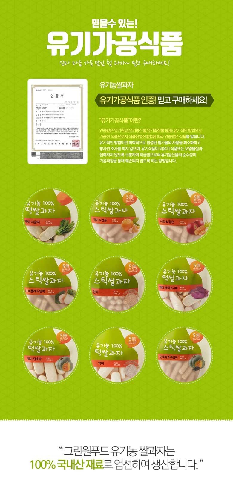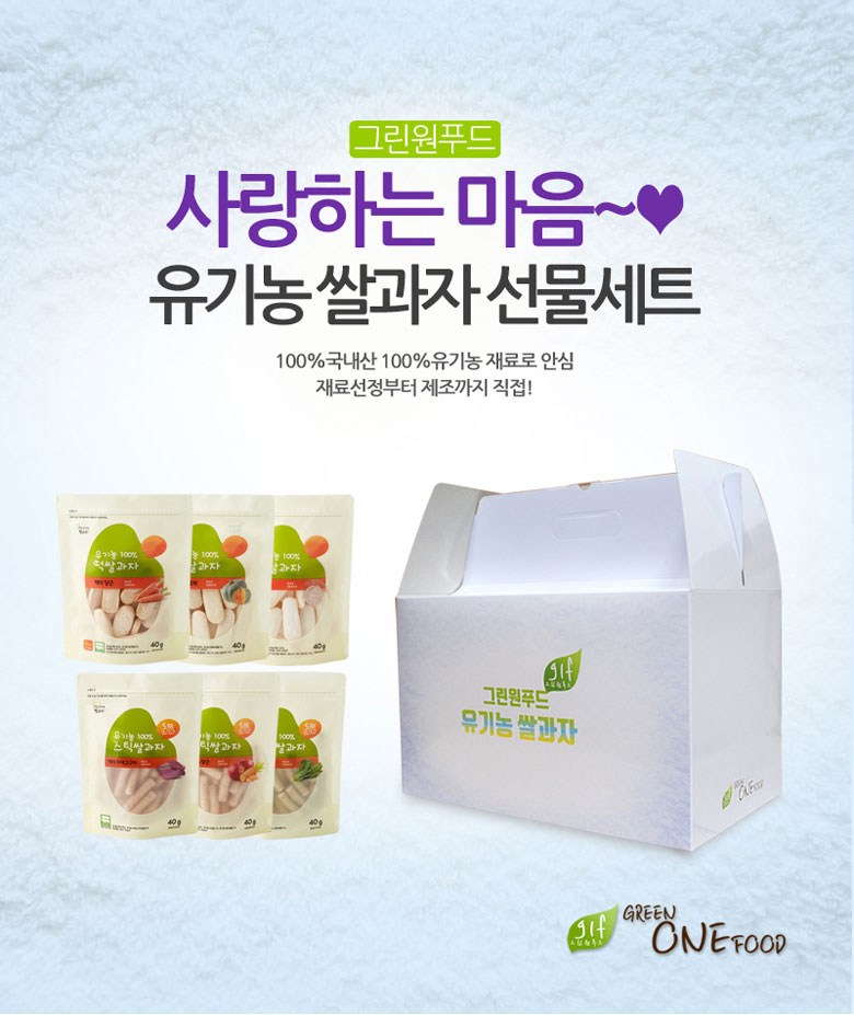 | 식품의 유형 | 과자 | 생산자 및 소재지 | 그린원푸드/경기도 하남시 검단산로 333번길 34 |