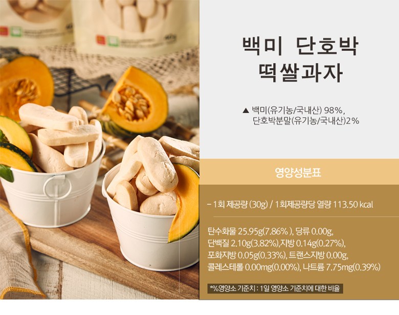 | 제조연월일, 소비기한 또는 품질유지기한 | 업데이트 예정 | 포장단위별 내용물의 용량(중량), 수량 | 백미40g + 백미단호박40g + 백미당근40g + 사과당근40g + 백미자색고구마40g + 백미시금치40g, 1개 |