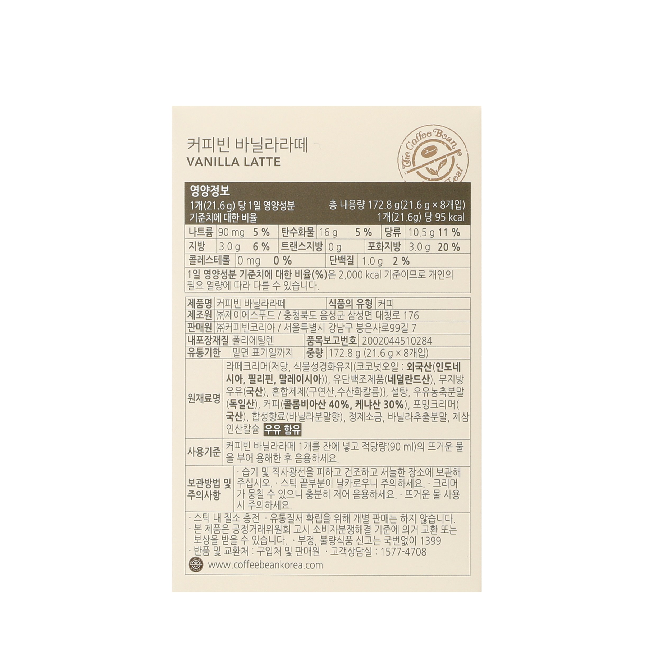 | 제품명 | 커피빈 바닐라라떼 | 식품의 유형 | 커피 |