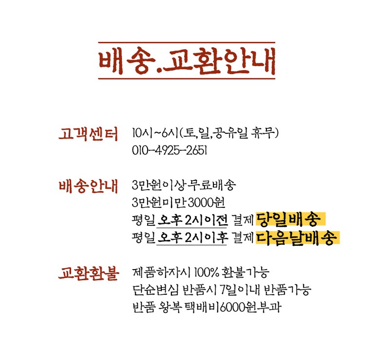 - ㆍ모니터 해상도의 차이로 인해 색상이나 이미지가 실제와 달라, 고객이 단순 변심으로 교환/반품을 무료로 요청하는 경우