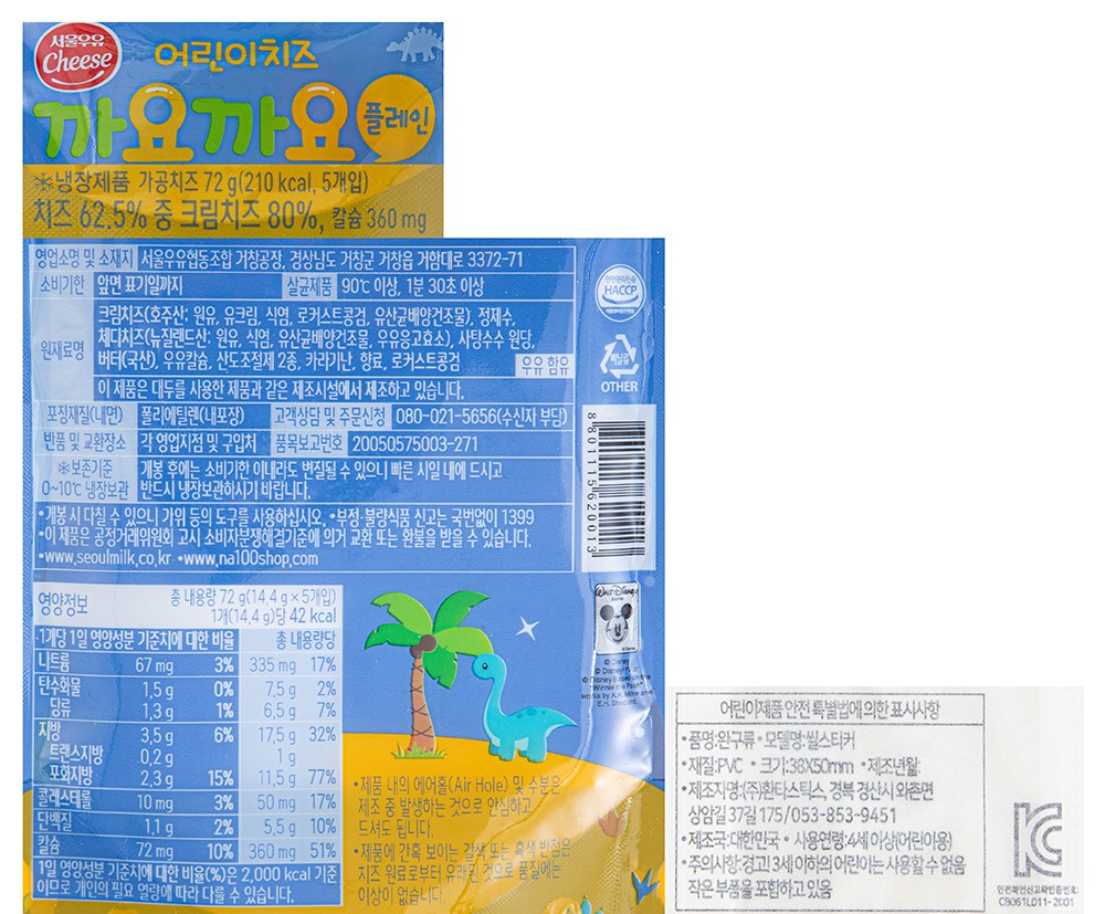 서울우유의 앙팡치즈 까요까요로 먹는 즐거움과 영양을 한 번에 선물해보세요. 사랑스러운 캐릭터가 눈길을 사로잡는 것은 물론, 손쉽게 까서 먹을 수 있는 포션형 치즈라 더욱 좋답니다. 신선한 크림치즈, 체다치즈와 버터 등의 재료를 사용했어요. 플레인의 고소하고 담백한 맛이 입안 가득 사르르 녹아들지요.