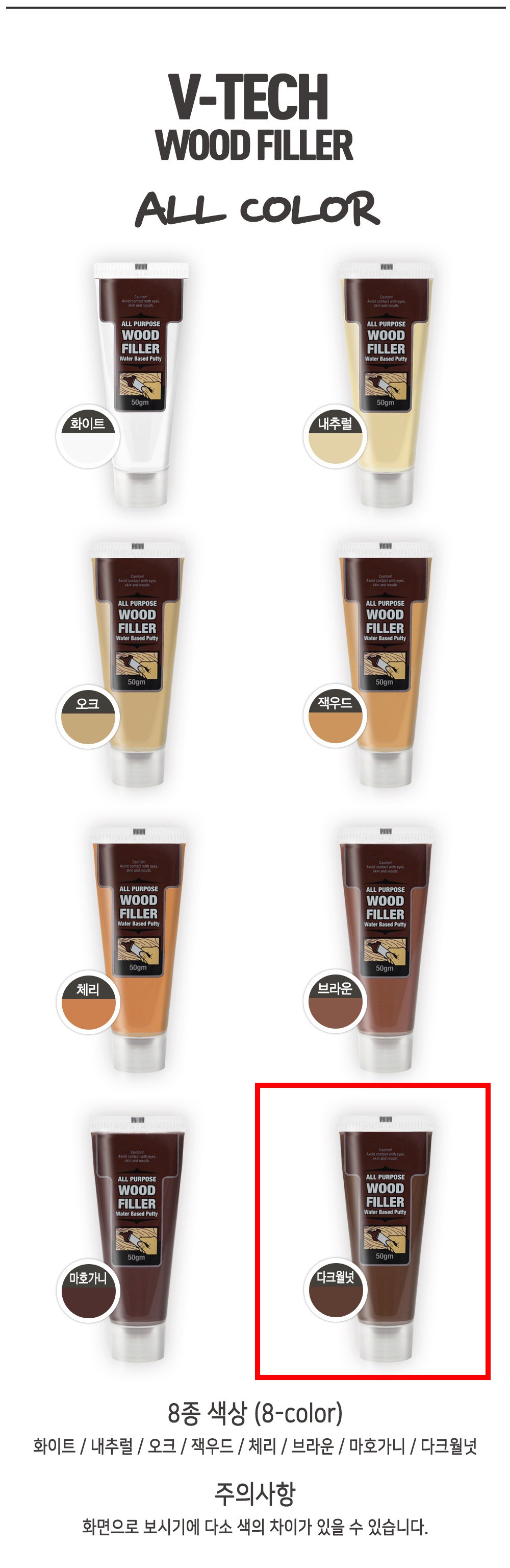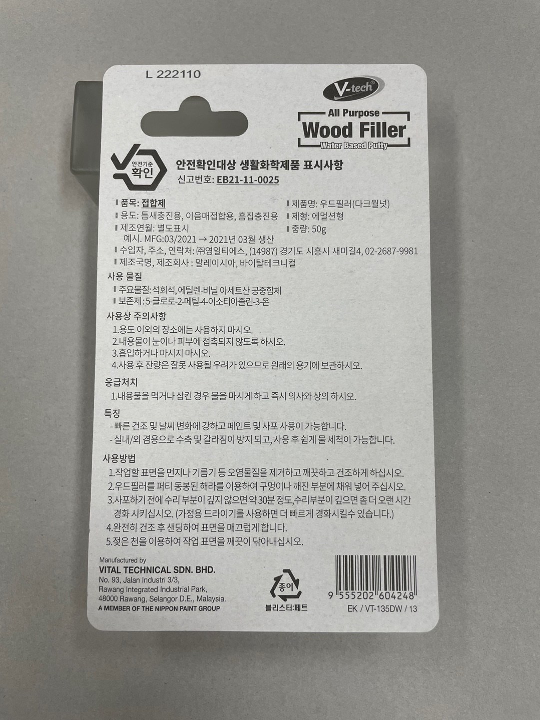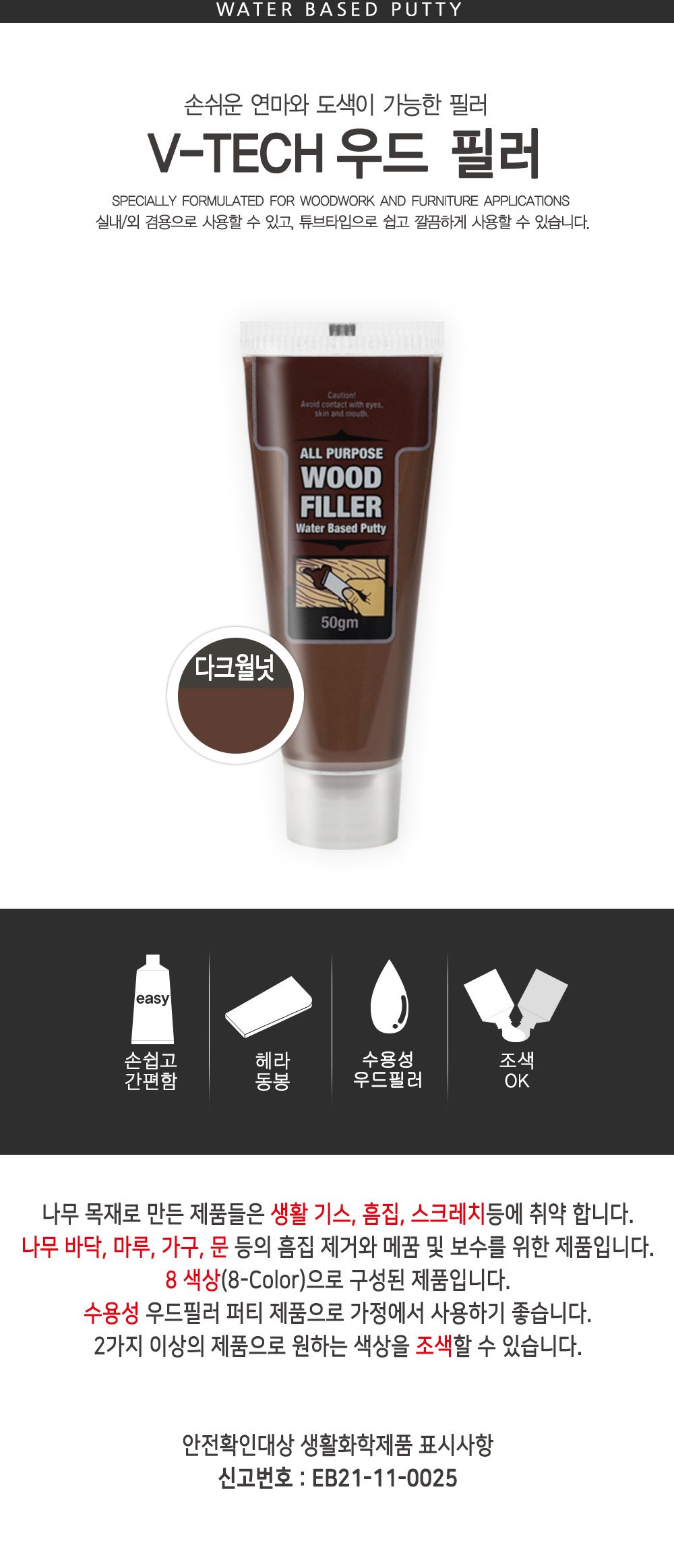 | 품목 및 제품명 | 접합제 / 우드필러(다크월넛) | 용도(표백제의 경우 계열을 함께표시) 및 제형 | 틈새충진용,이음매접합용,흠집충진용 / 비분사형-에멀션형 |