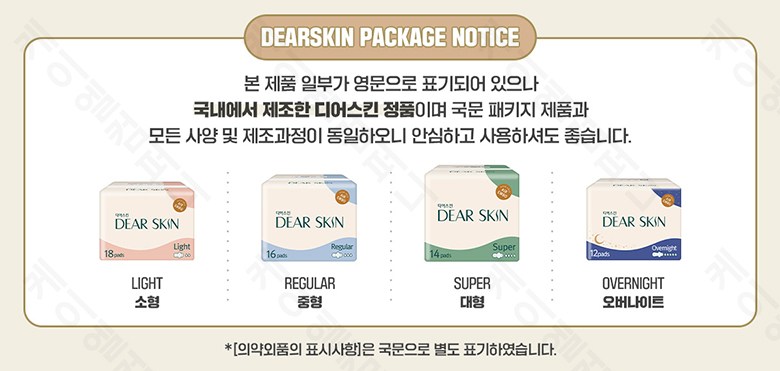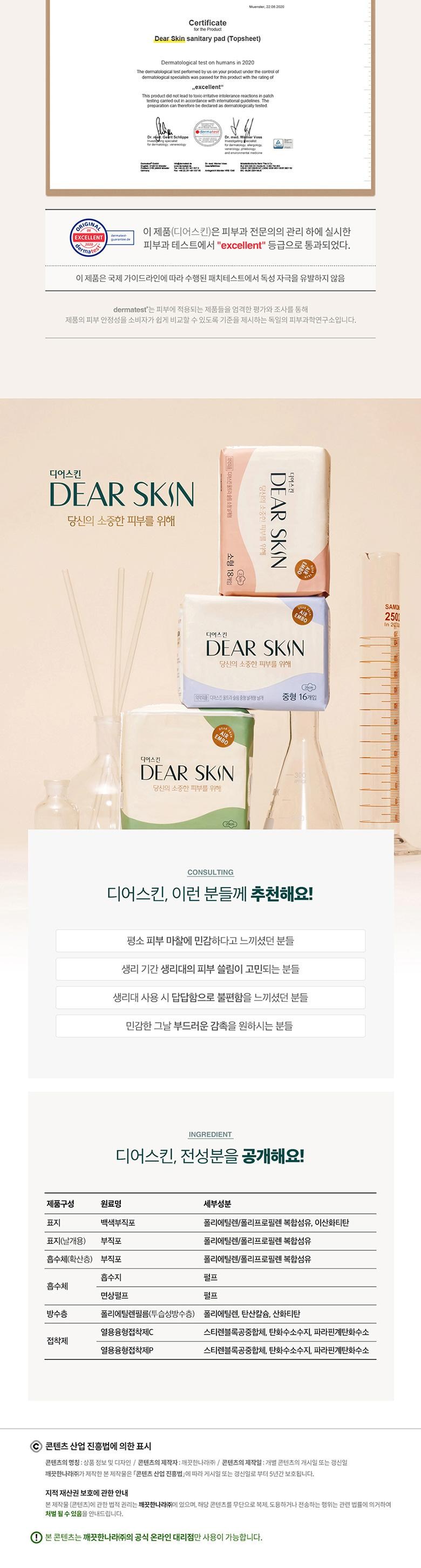 | 품명 및 모델명 | 깨끗한나라 디어스킨 울트라슬림 날개형 중형 16Px3팩 생리대 | 인증/허가 사항 | 해당사항없음 |
