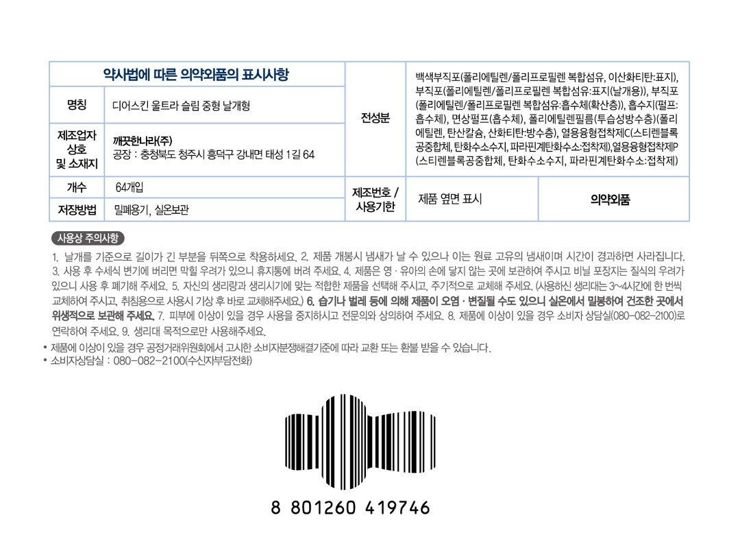 | 품명 및 모델명 | 디어스킨울트라슬림중형날개형 | 인증/허가 사항 | 의약외품 |