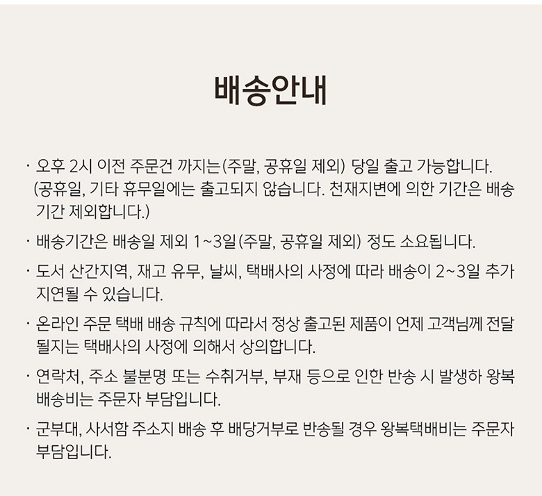 - ㆍ모니터 해상도의 차이로 인해 색상이나 이미지가 실제와 달라, 고객이 단순 변심으로 교환/반품을 무료로 요청하는 경우