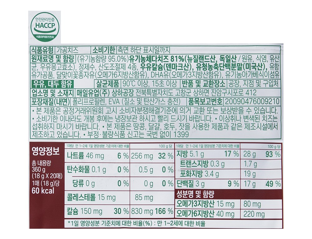 | 제품명 | 3STEP 유기농 어린이치즈 | 식품의 유형 | 가공치즈 |