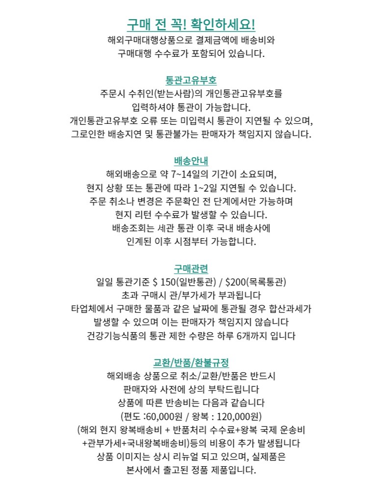 | 배송방법 | 해외직구 | 배송비 | 무료배송 - 도서산간 지역 배송불가 |