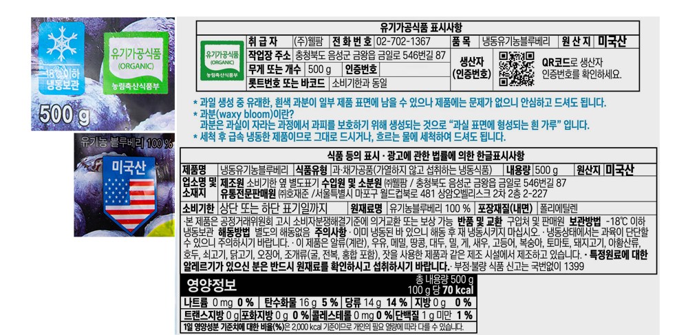 | 제품명 | 냉동유기농블루베리 | 식품의 유형 | 컨텐츠 참조 |