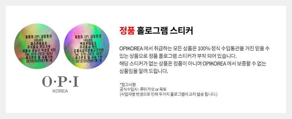 | 화장품제조업자, 화장품책임판매업자 및 맞춤형화장품판매업자 | OPI / (주)옥토 | 제조국 | 미국 |