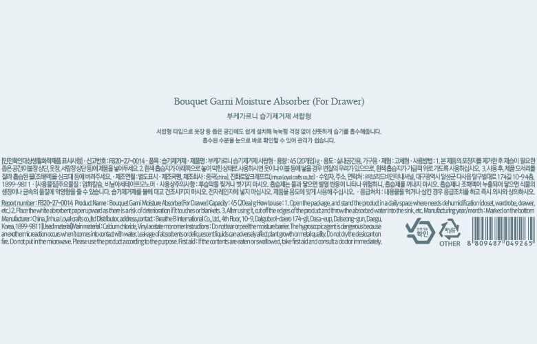 | 품목 및 제품명 | 습기제거제 / 부케가르니 습기제거제 서랍형 | 용도(표백제의 경우 계열을 함께표시) 및 제형 | 가구용,실내공간용 / 고체형 |
