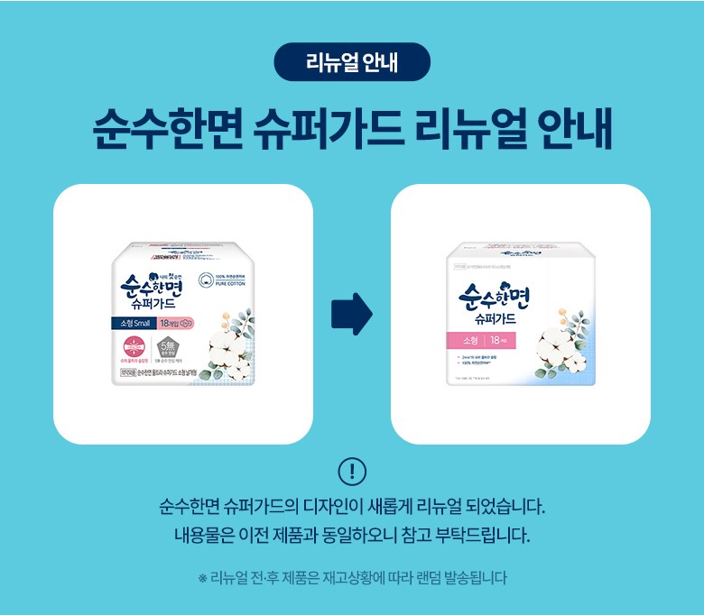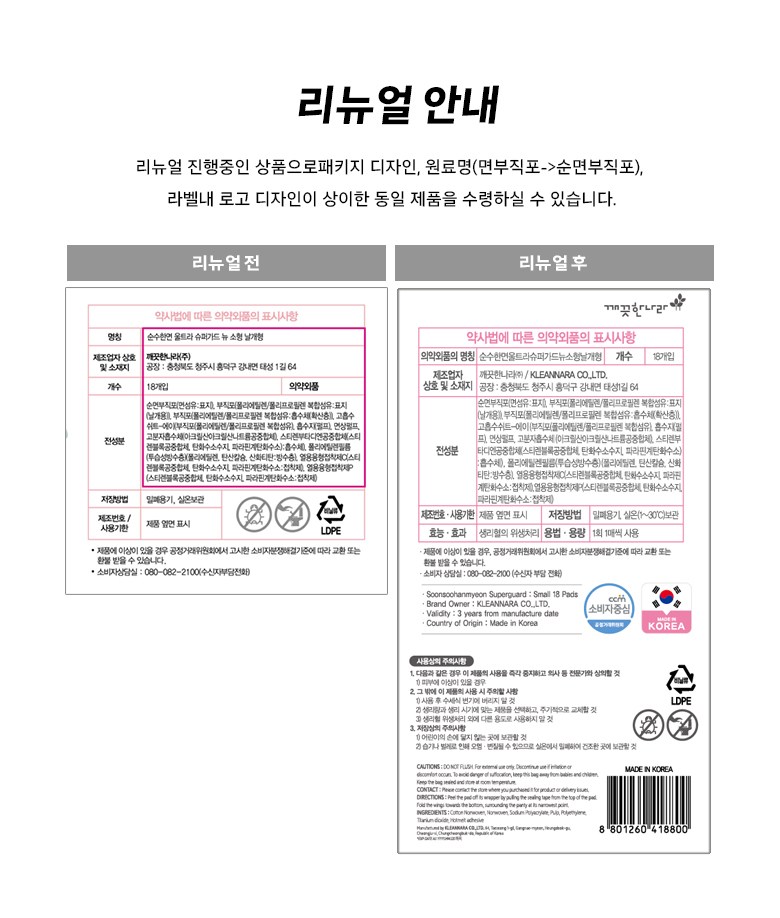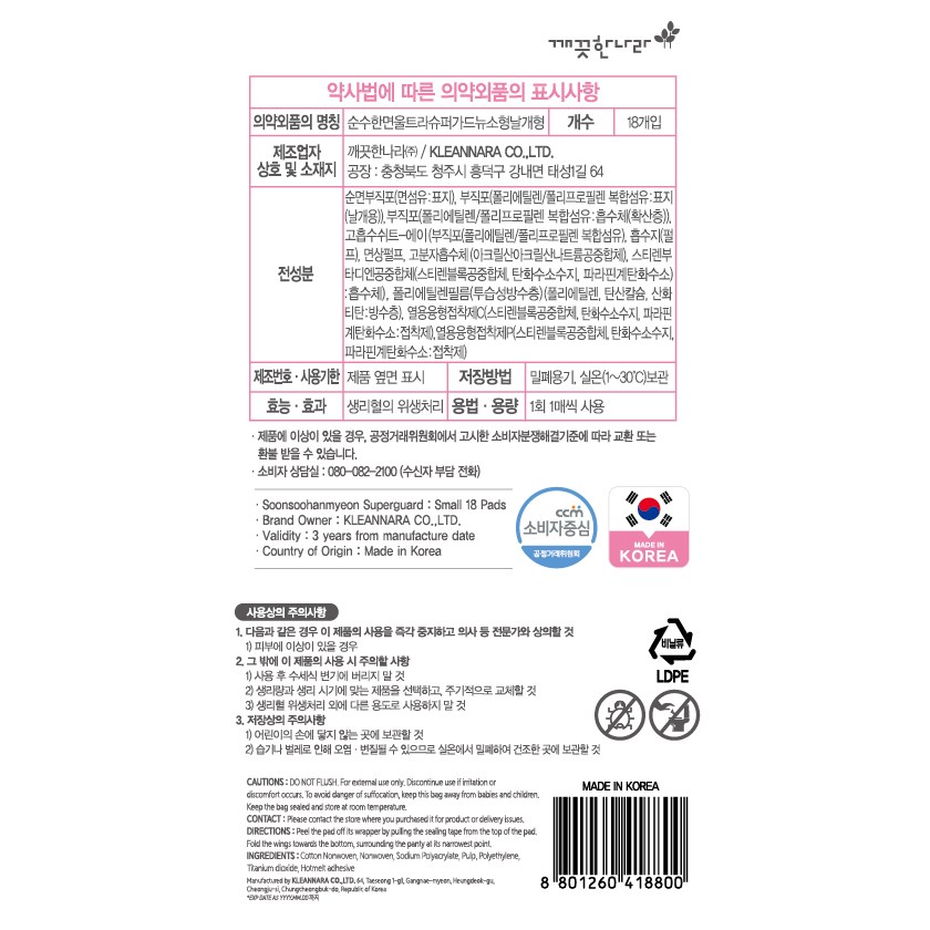| 품명 및 모델명 | 순수한면울트라슈퍼가드뉴소형날개형 | 인증/허가 사항 | 의약외품 |