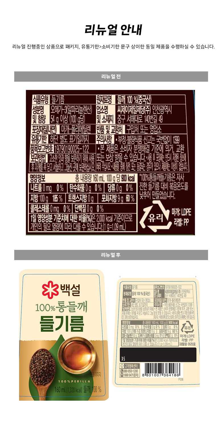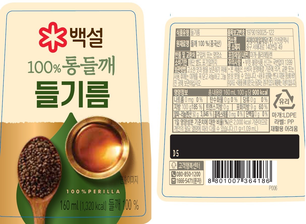 | 제품명 | 100% 통들깨 들기름 | 식품의 유형 | 컨텐츠 참조 |