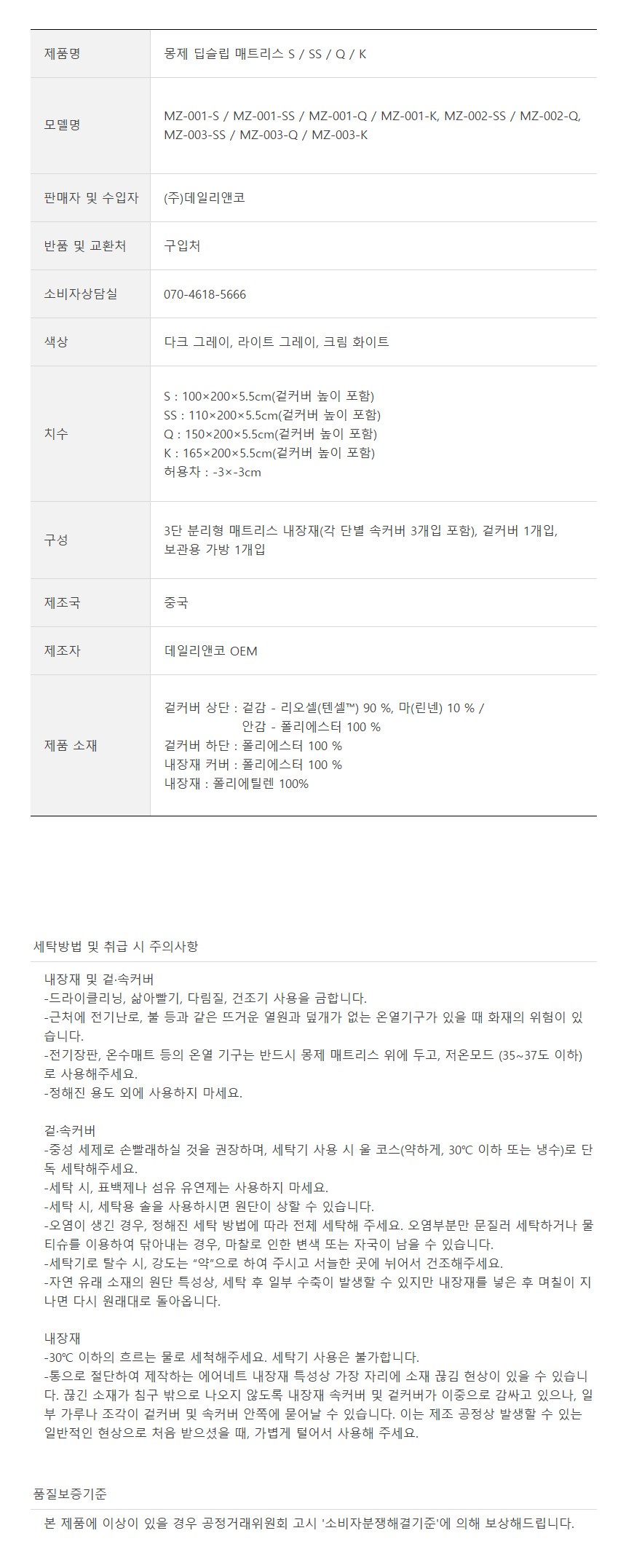 | 품명 및 모델명 | 몽제 딥슬립 매트리스 | KC 인증정보 | CB015R1165-9001 |