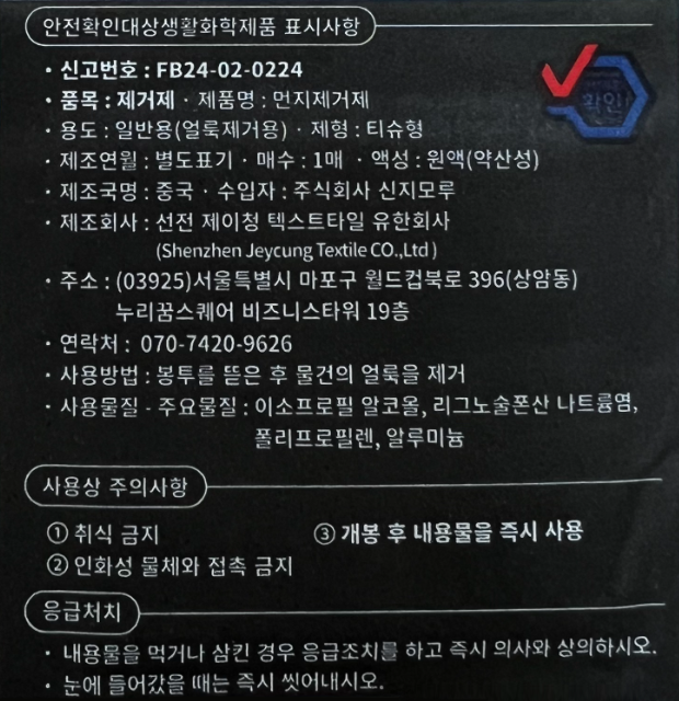 | 제조국(원산지) | 본품: 중국ㅣ알콜솜: 컨텐츠 참조 | 제조자(수입자) | 필름: (주)신지모루 / 업체미제공 | 알콜솜: 컨텐츠 참조 |