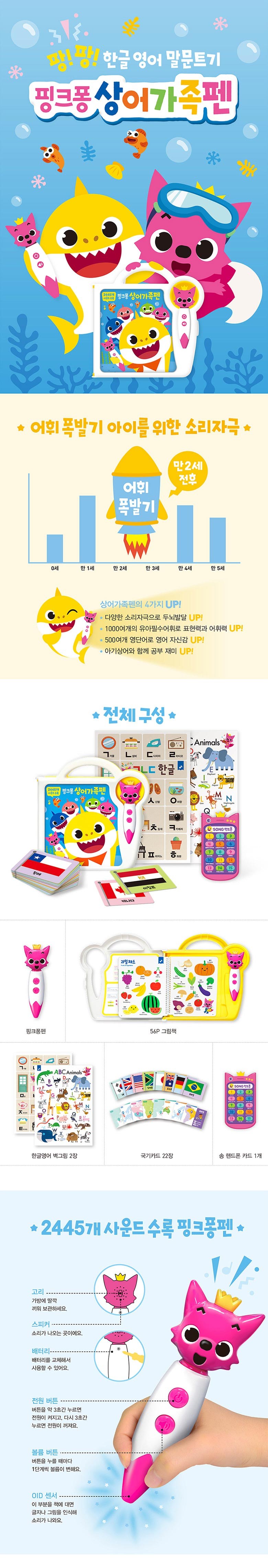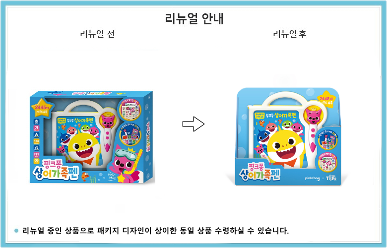 | 품명 및 모델명 | 핑크퐁 상어가족펜 | KC 인증정보 | 본품 : CB064R1399-8003 / 건전지 : B053R187-4001 |