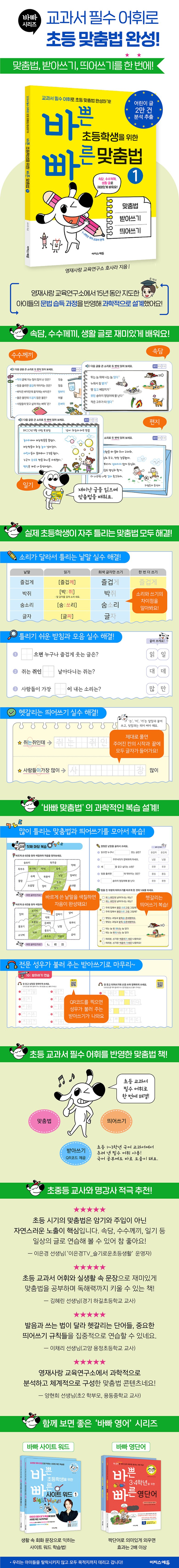 | 도서명 | 바쁜 초등학생을 위한 빠른 맞춤법 1 | 저자, 출판사 | 영재사랑 교육연구소 , 호사라 지음 , 이지스에듀 |