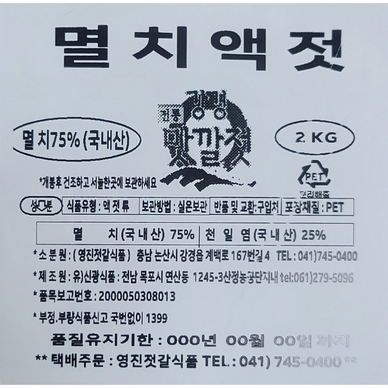 | 품목 또는 명칭 | 멸치액젓 | 포장단위별 내용물의 용량(중량),수량,크기 | 2kg,5kg,10kg |
