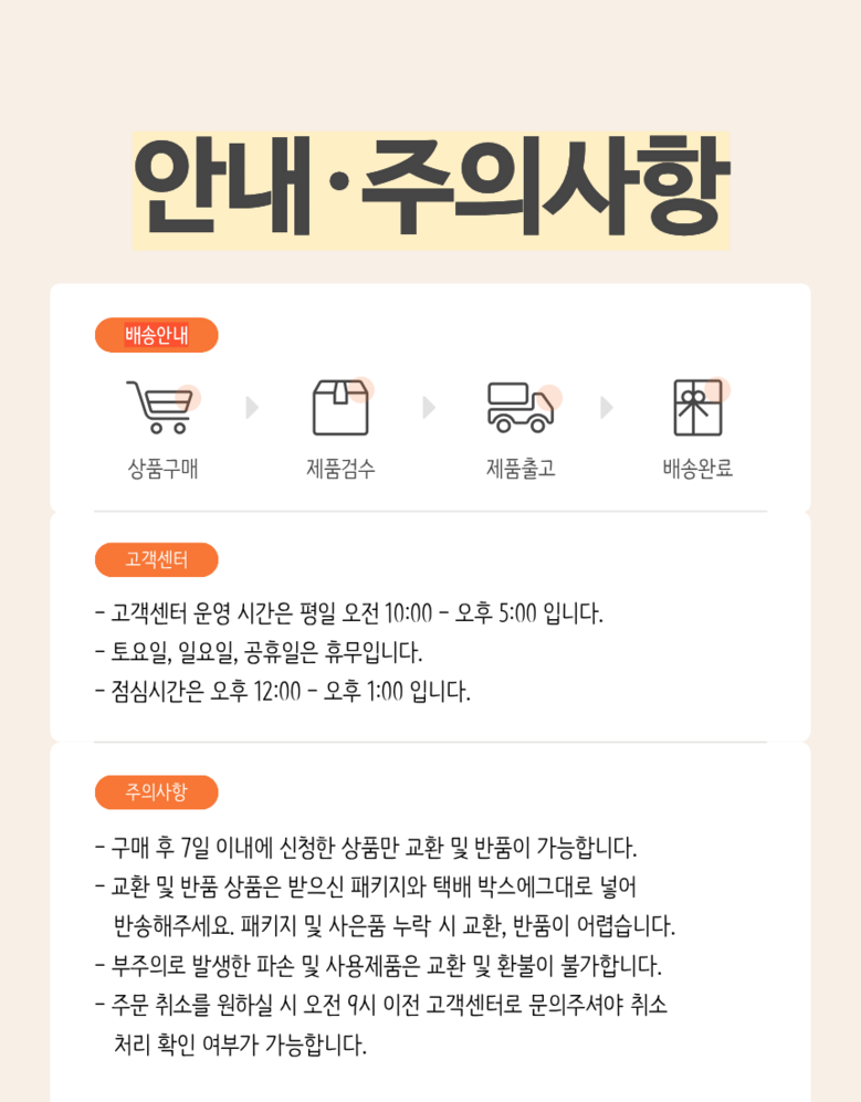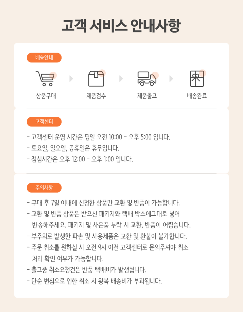 | 배송방법 | 순차배송 | 배송비 | 3,000원 - 50,000원 이상 구매 시 무료배송 - 도서산간 지역 배송불가 |