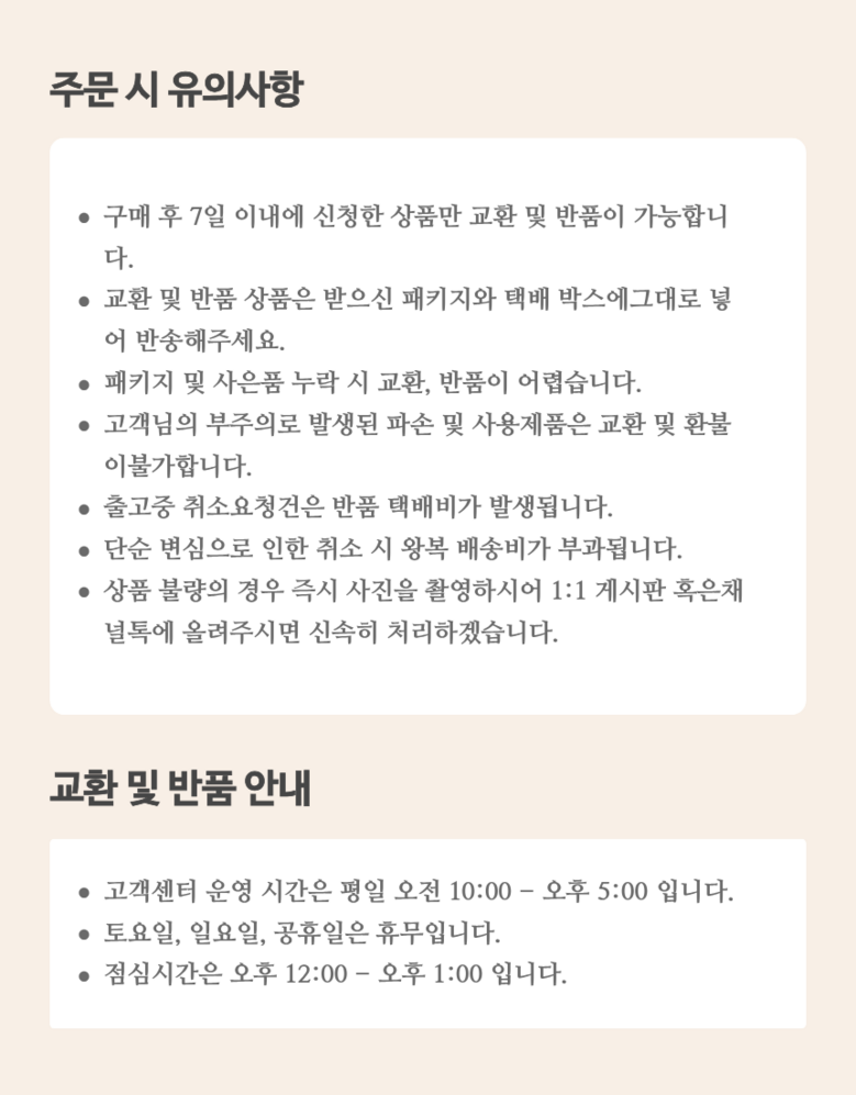 - ㆍ모니터 해상도의 차이로 인해 색상이나 이미지가 실제와 달라, 고객이 단순 변심으로 교환/반품을 무료로 요청하는 경우
